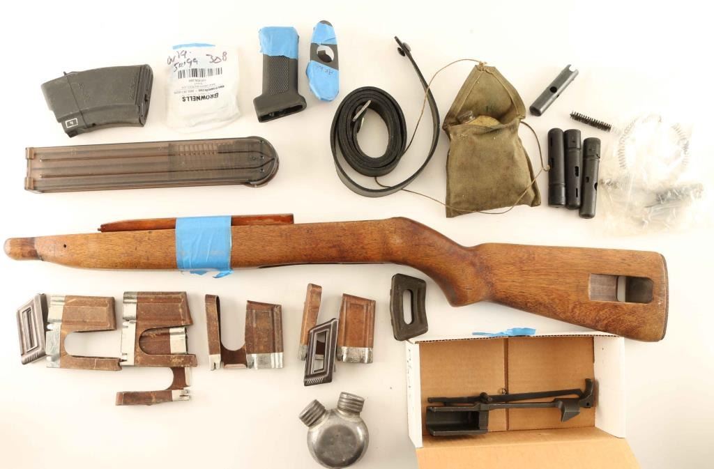 M2 parts including stock, springs and others, Russian parts including oilers, springs, belt, grip and more, misc clips and mags, and (2) pairs of wood grips.