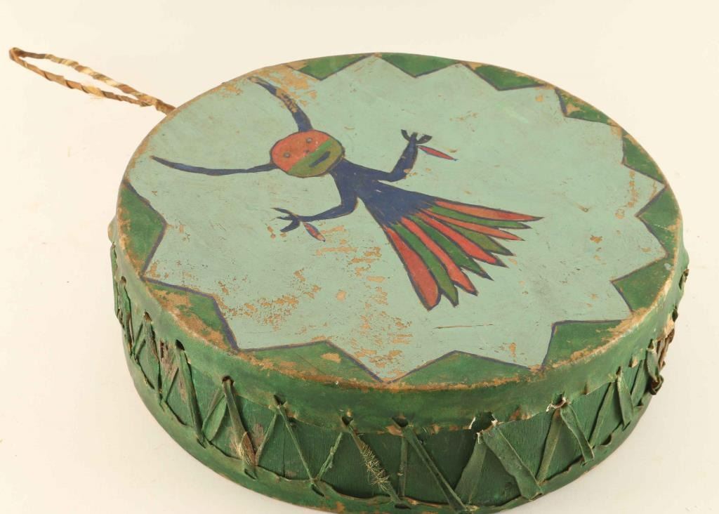 Hide wrapped drum painted green with Kachina images on both sides. Measures 3 1/2"h x 12"dia. Paint has worn off in some areas.