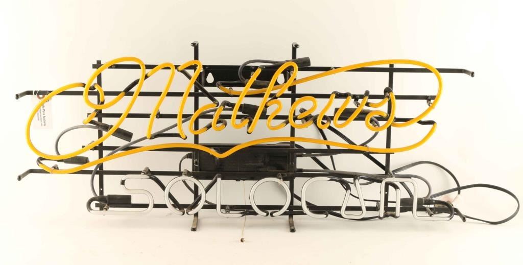 Yellow and white neon light that reads "Mathews Solocum" 36"l x 15"h x 5 1/2"w. Working at time of description.
