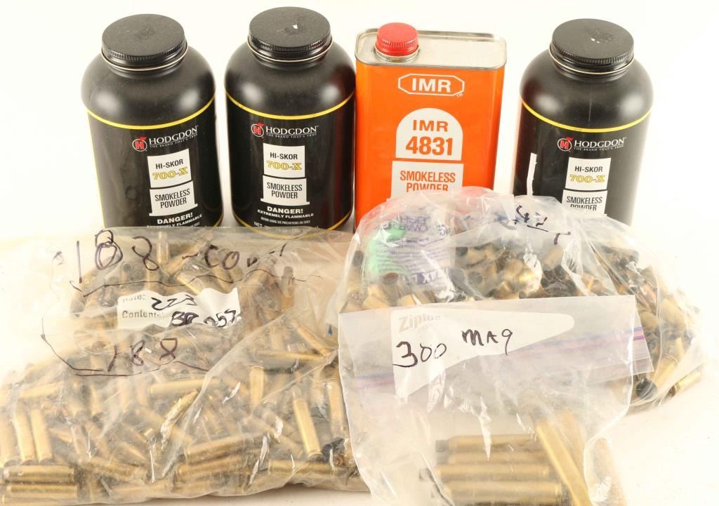 Approx. 3 lbs of powder for reloading and misc. brass including .223