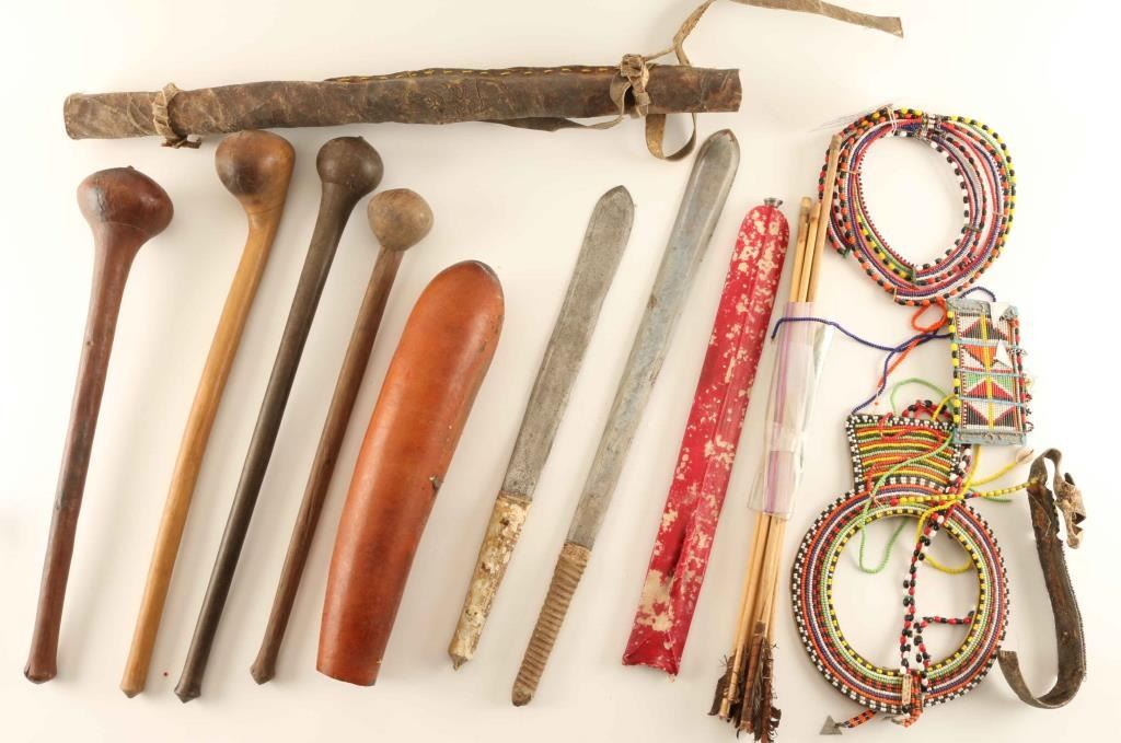 Includes 4 spears, 2 Simi knives, arrows, beaded necklace and more.
