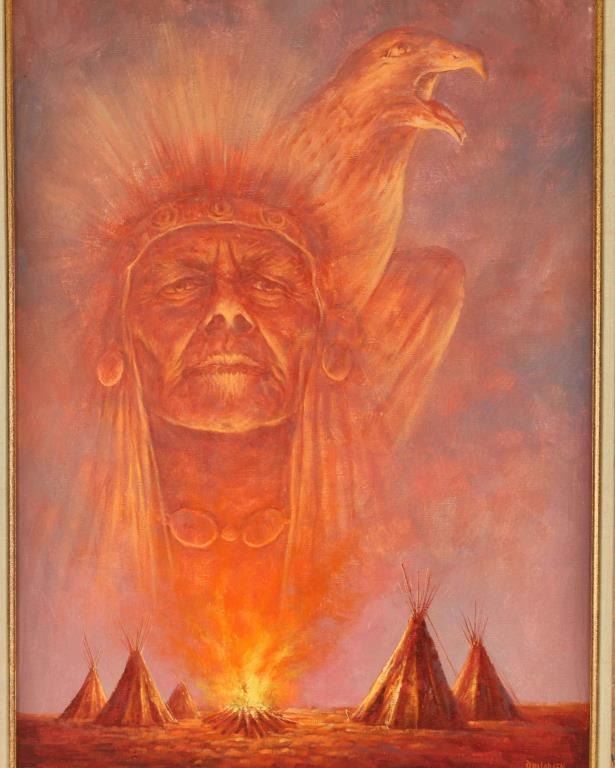 depicting an Indian Chief spirit rising from a fire, signed lower right hand corner . Image size 36"x23 1/2" in wood and gold frame.