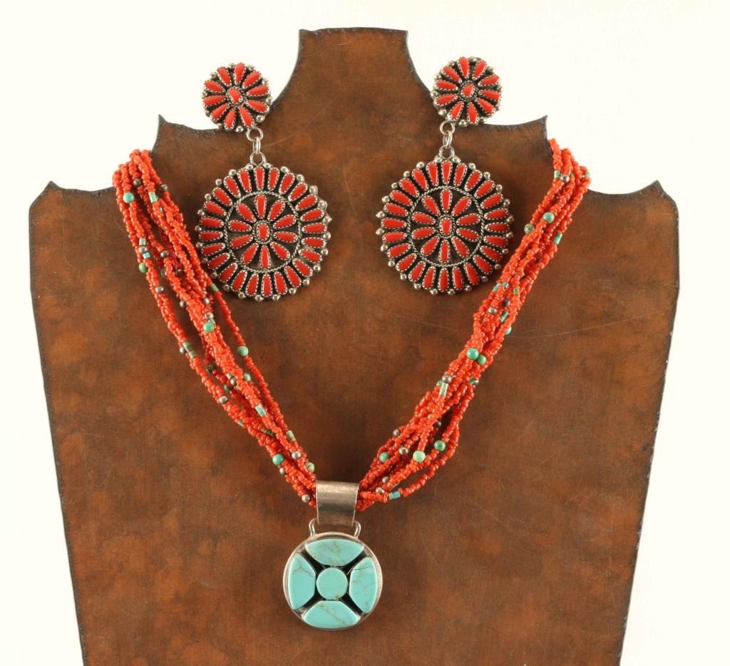 (1) Pendant with floral motif turquoise stones set in sterling silver on a nine strand coral, turquoise and silver bead necklace. (1) pair of coral cluster dangle clip on earrings set in sterling marked 'BA'. (1) pair of sterling clip on earrings with geometric designs and a turquoise cab on each