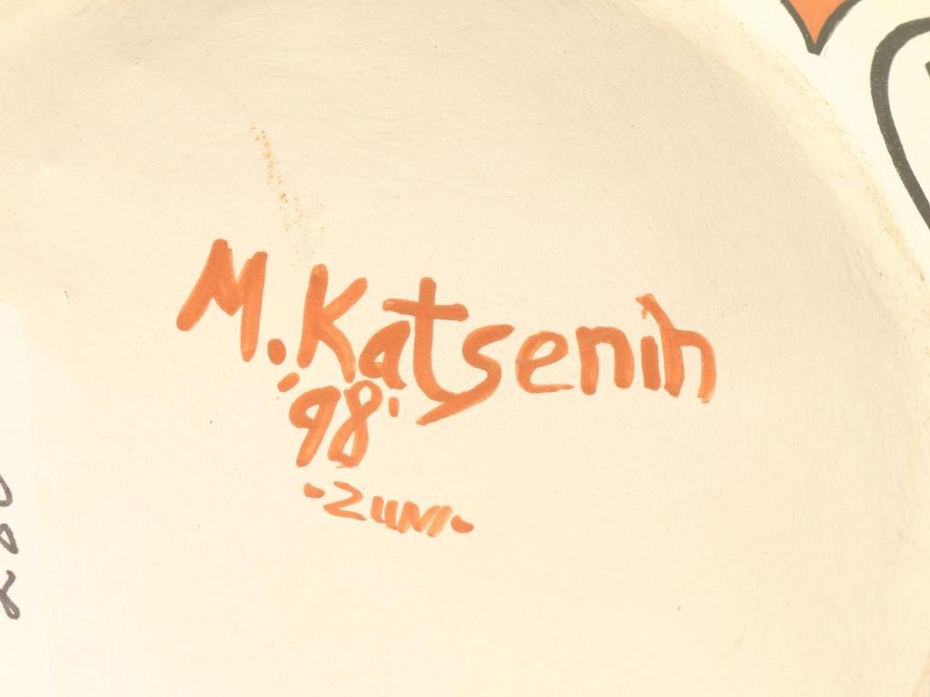 Large floral motif with bird effigies inside. Signed 'M. Katsenin'. Measures 6 3/4"h x 7 1/2" dia. Comes with wooden stand.