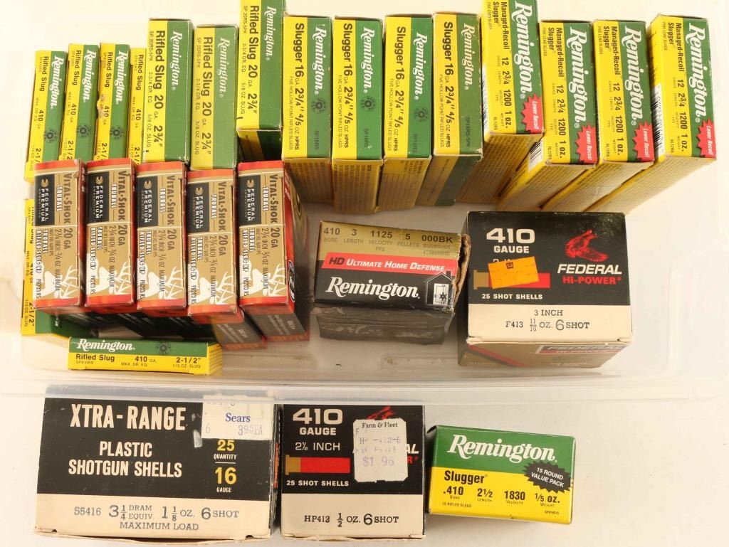 Includes approx. 15 rounds of 12 gauge slugs, 15 rounds of 16 gauge slugs, 30 rounds of 20 gauge slugs, 50 rounds of 410 gauge bird shot and 25 rounds of 410 slugs and mixed box of 12 and 16 gauge.