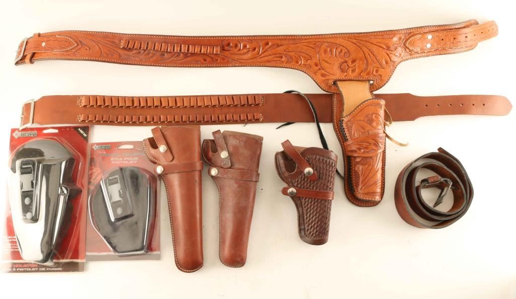 Hunter leather holsters, handmade Viking leather basketweave holster, several webbing holsters by Bianchi and more. Also includes a leather cartridge belt size 36, floral tooled belt with holster size 38 and misc. straps.