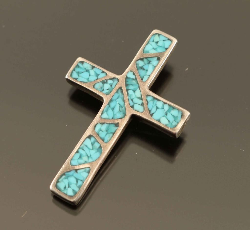 (1) Lapis, coral and turquoise set in sterling silver in a small rectangle. Marked 'DZ' and 'Sterling'. (1) Lavender sugilite pendant inlaid in an oval of sterling silver with thin turquoise lines. Measures 1 1/4" l, marked 'BGM' with hallmark and '925'. (1)Sterling Silver Cross Pendant (1) Turquoise & Sterling Cross Pendant (1) Zuni inlaid pendant-circle of silver with turquoise and coral chip inlay in an 'X' pattern. Measures 1" dia. with artist's hallmark on back. (1) Floral inlaid pendant with sterling petal outlines set with turquoise and lapis chips. Marked 'ACE' and 'Sterling' with hallmark. Measures 1" dia.