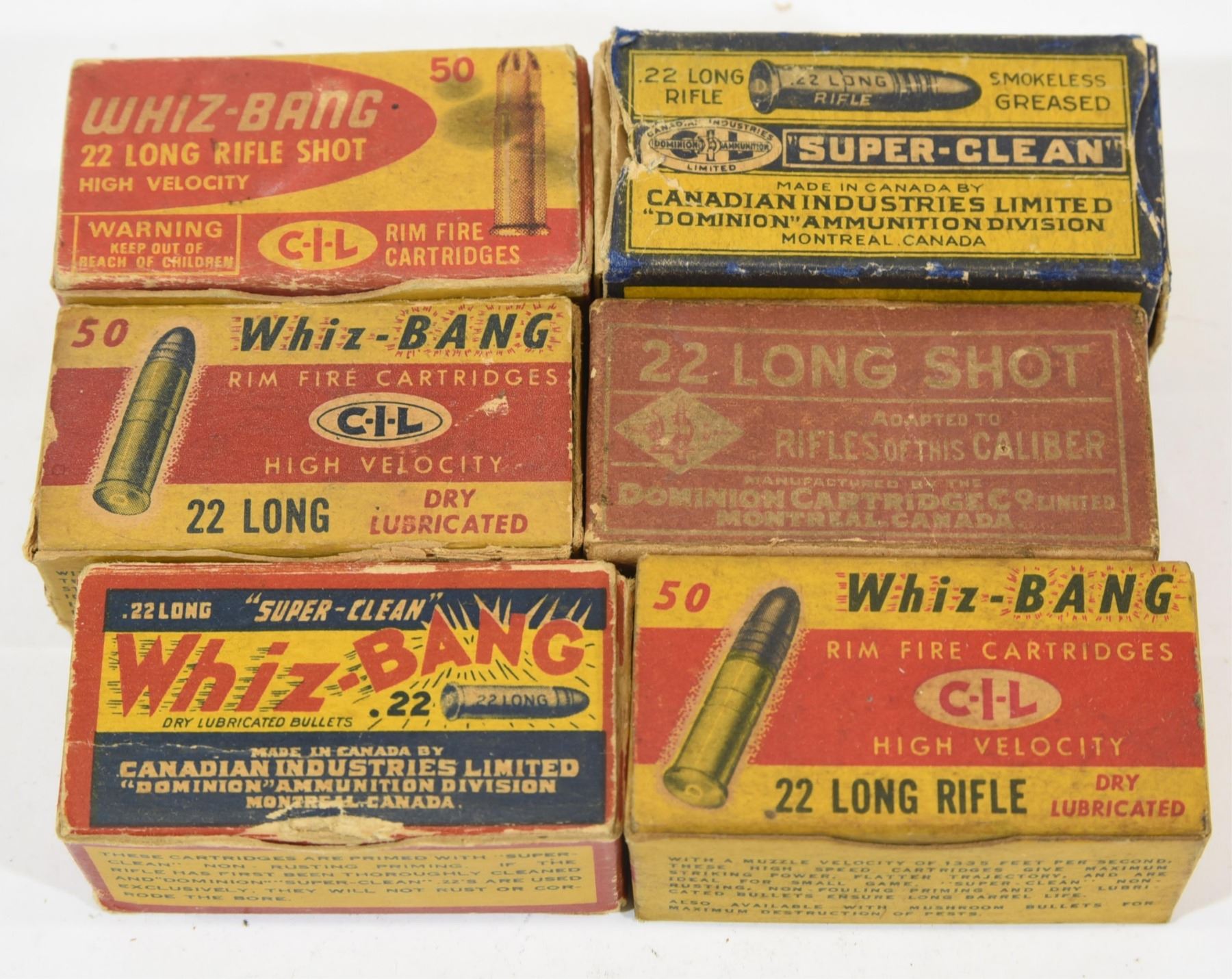 18 Rounds of Dominion 22 Long Shot in Original Box. 44 Rounds of CIL Whiz Bang Dry Lubricated 22 LR in Original Box. 18 Rounds of CIL Whiz Bang Dry Lubricated 22 Long in Original Box. 50 Rounds of CIL Whiz Bang Dry Lubricated 22 Long in Original Box. 38 Rounds of CIL Super-Clean Greased 22LR in Original Box. 22 Rounds of CIL Whiz Bang 22LR Shot in Original Box.