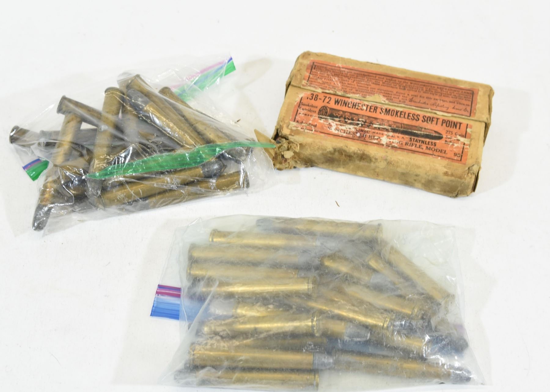 1) 18 rnds. head stamp W.R.A. Co. 38 - 72 W.C.F. 2) 20 rnds. 38 - 72 made with Hornady 405 Win brass 3) 20 rnds. vintage 38 - 72 Winchester Smokeless Soft Point in original box, box is in poor condition