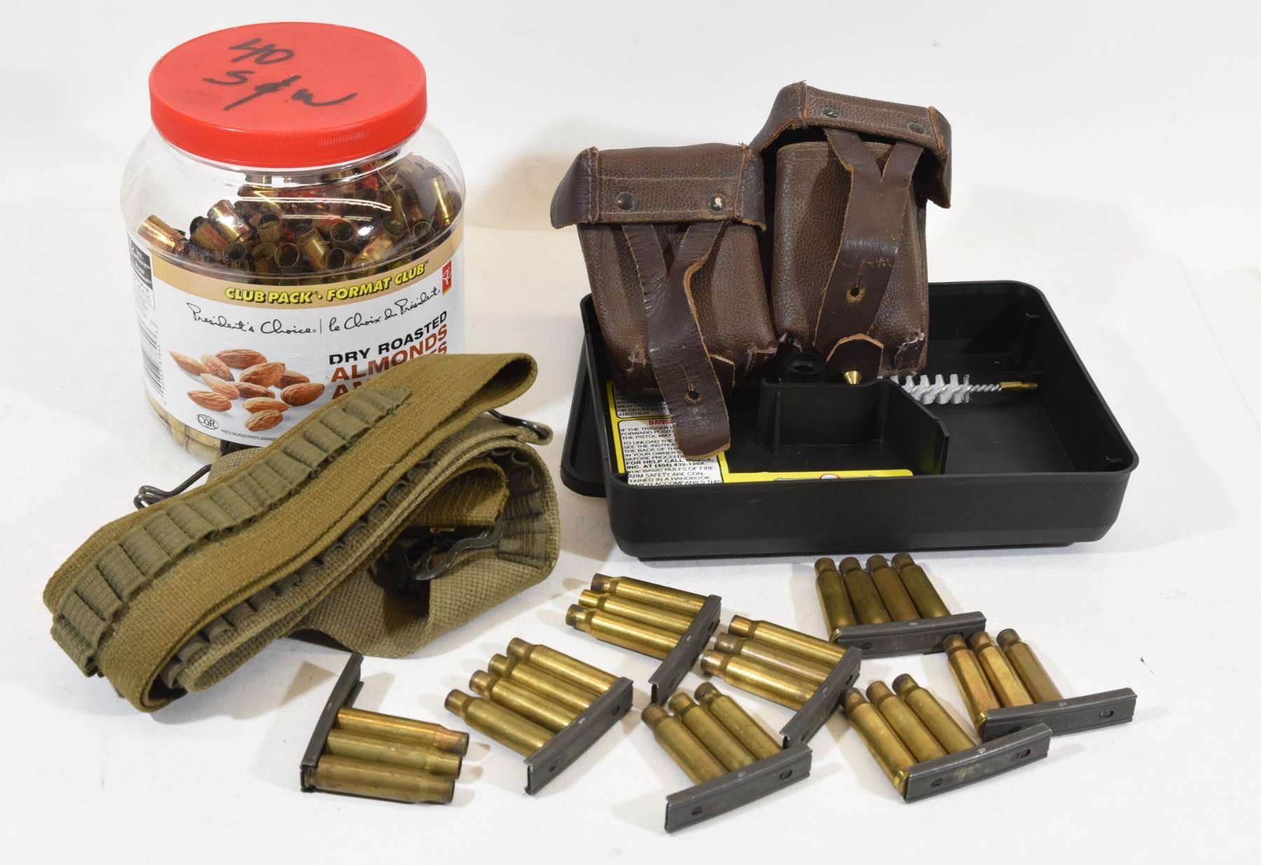 Glock Box, 40 S&W Brass, 8 stripper clips with 308 WIn brass, two canvas ammo belts, ammo pouch.