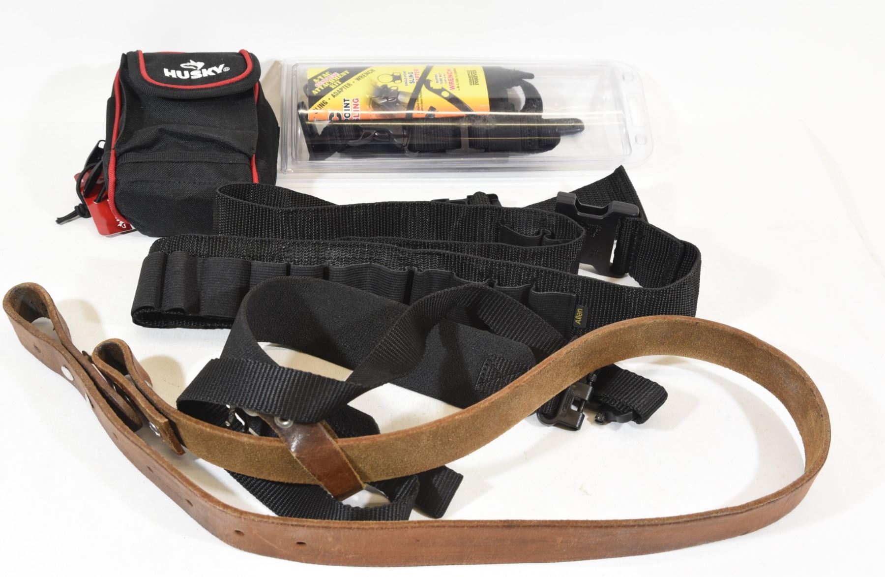 1 leather and 1 nylon sling, Husky 4" belt pouch new, nylon ammo belt, A-Tac sling adapter with a buffer tube nut wrench