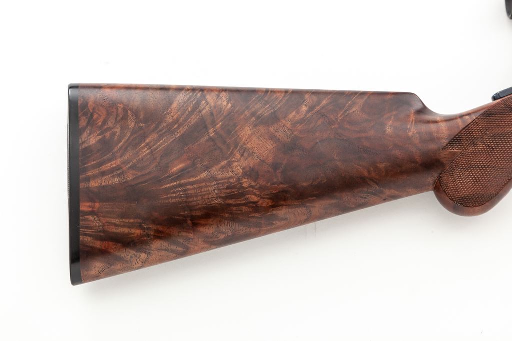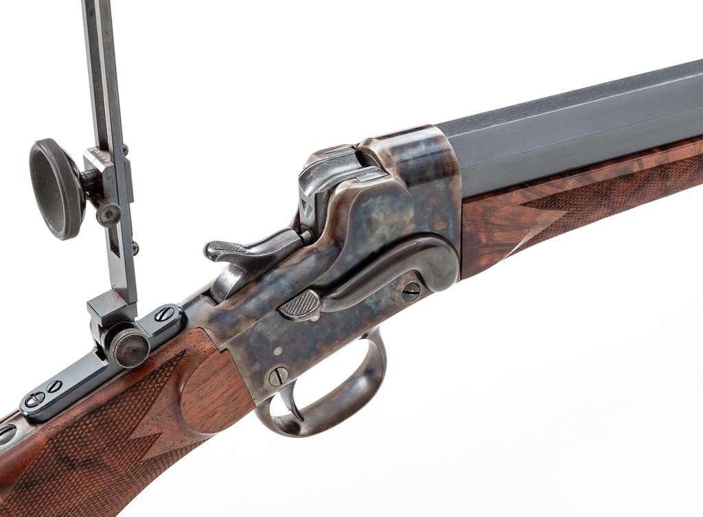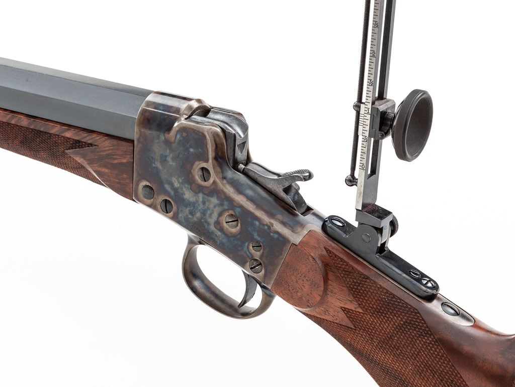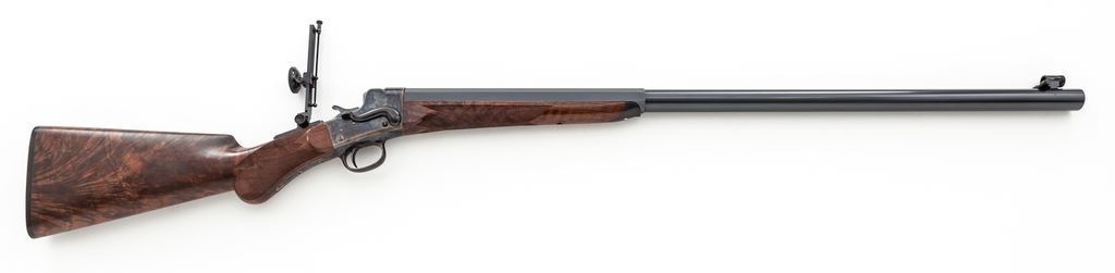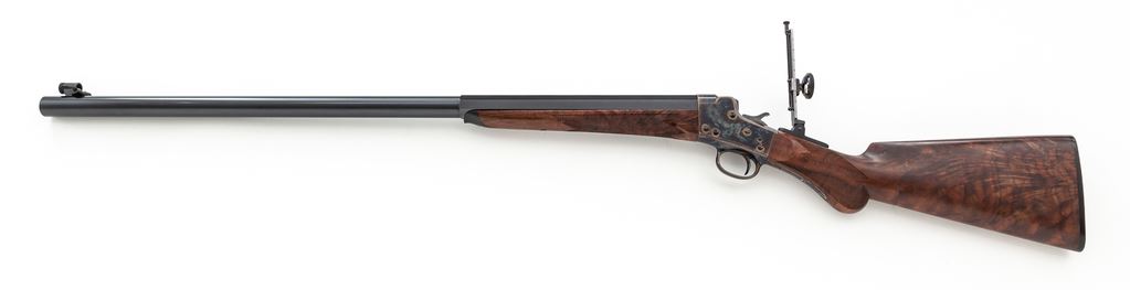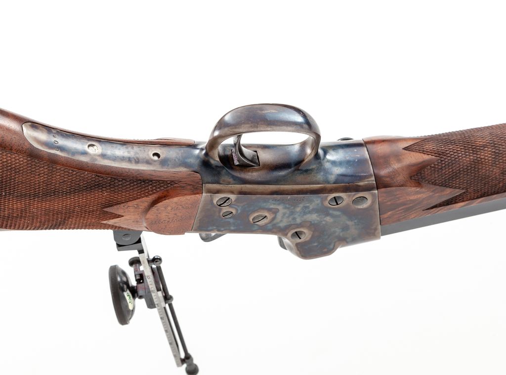 Remington-Hepburn No. 3 Rifle, #8063, .45-90 cal., 32'' half-round blue barrel, case hardened frame restored by Turnbull, fancy checkered walnut stock with round pistol grip, modern mfg'd long-range tang sight, as well as a modern spirit level globe front sight. Condition is excellent as restored and updated. Metal surfaces retain almost all of their professionally accomplished blue and case colors. New made barrel exhibits an excellent mirror bright bore. Action is crisp, trigger pull is nice. Est.: $2,500-$3,500. (C&R)
