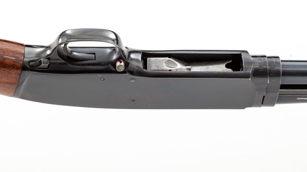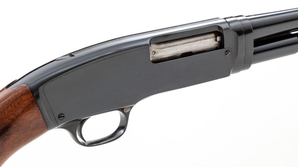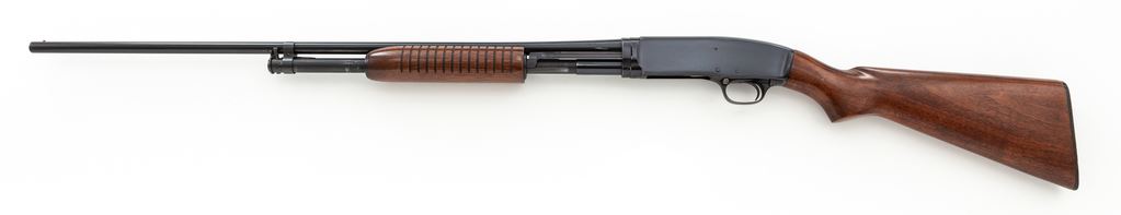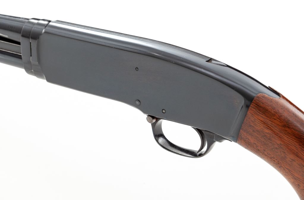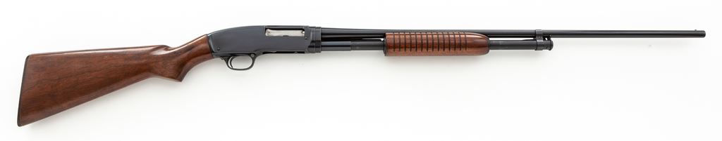 Winchester Model 42 Standard Grade Slide-Action Shotgun, #147388. .410 bore 28'' plain barrel has a 3'' chamber and is choked Full. Forend is the late 14-groove configuration with flat bottom, and pistol-grip buttstock is the post-war version, but with an early (pre-'59) Winchester buttplate. Mfg'd 1961. Condition is excellent and original, showing little use, and does not appear to have been reblued. There are a few small handling marks to the wood, but almost none to the metal, other than slide wear. Bore is a little dirty but not damaged. A nice little Model 42. Est.: $1,500-$2,000. (C&R)