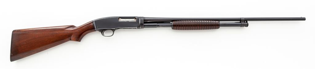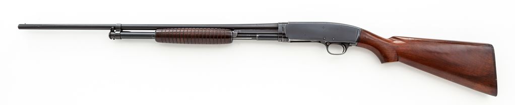 Winchester Model 42 Standard Grade Slide-Action Shotgun, #53097. 26'' .410 bore plain barrel has 3'' chamber and is choked Full. Forend is 18-groove early ''tootsie roll'' configuration, and pistol-grip buttstock has no grip cap or checkering, but has original early Winchester buttplate. Mfg'd 1946. Condition is very good and 100% original, with many pre-war features in this early post-war gun. Wood has some handling marks; there is carry wear to the receiver bottom, but little wear to the action, which functions well. Bore is dirty but not pitted. Est.: $1,250-$1,750. (C&R)