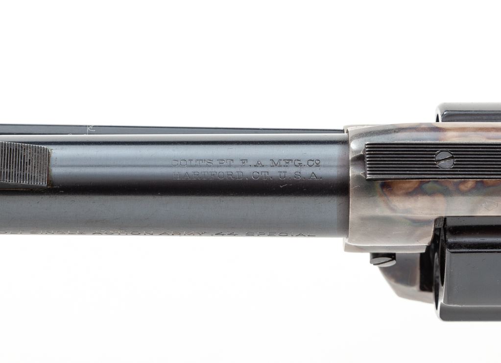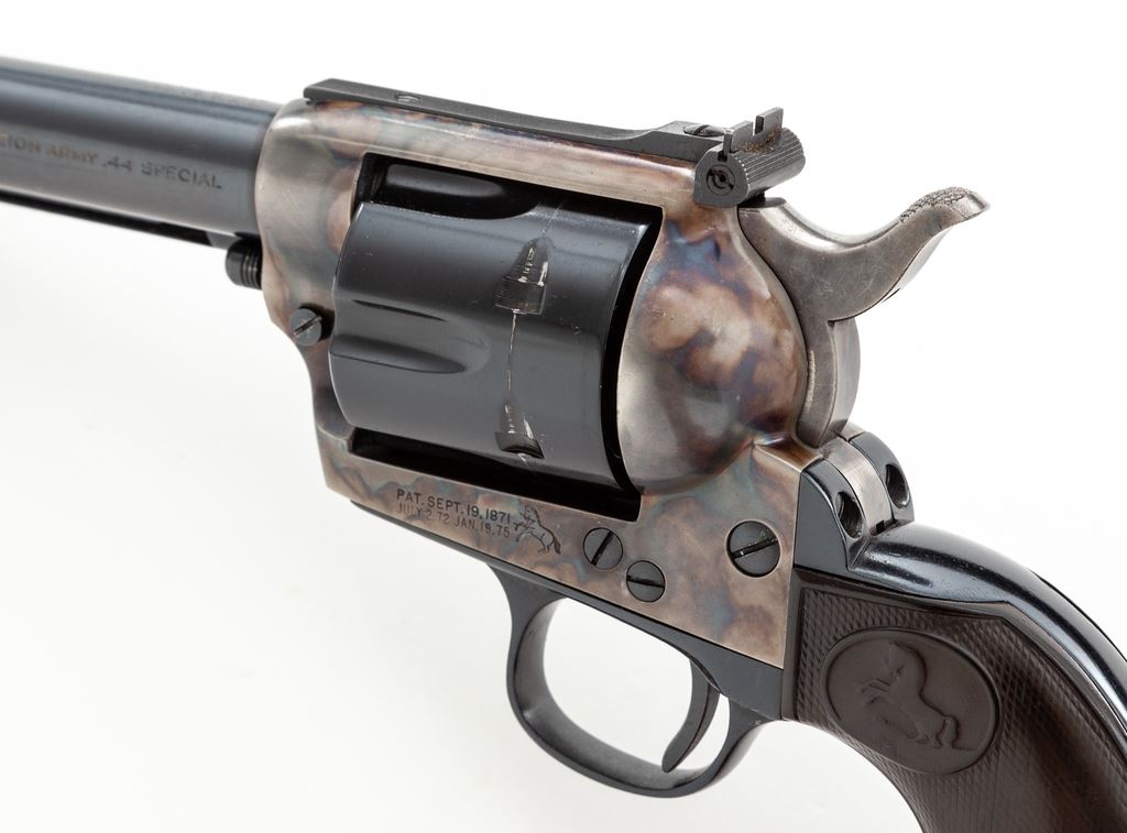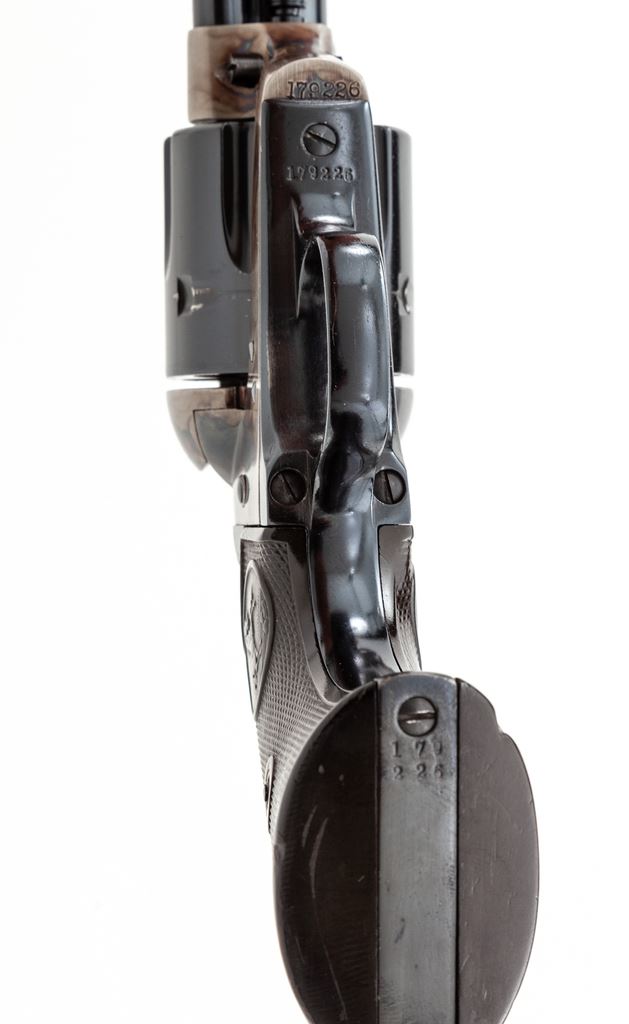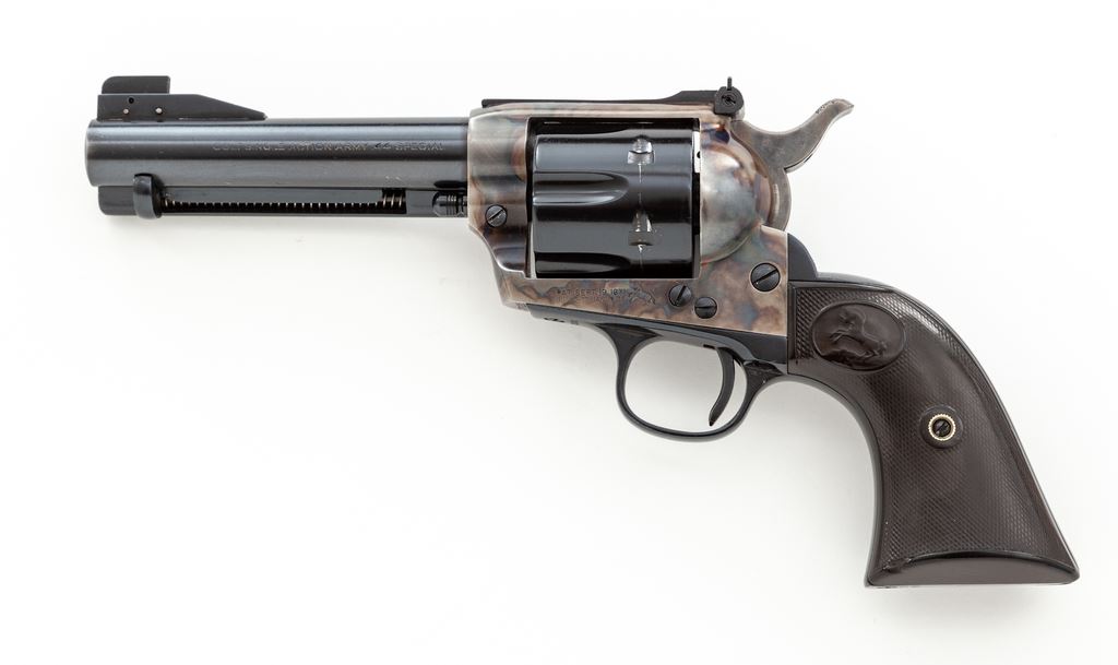 Colt Model 1873 Single Action Army Cartridge Revolver, with target sights, #179226, .44 Spec. CF cal., later 4.75'' round barrel with two-line ''Colt's Pt. F.A. Mfg. Co. / Hartford, CT U.S.A.'' address and ''Colt Single Action Army .44 Special'' on left side, left frame with two-line 1871-72-75 patent dates and ''Rampant Colt'' logo, blued and case hardened finish, steel grip straps with two-piece checkered hard rubber grips with ''Rampant Colt'' logo in oval panel at top. Mfg'd 1898. A composite gun having later barrel, cylinder and sights, with matching serial numbers on the frame, backstrap and triggerguard; loading gate is marked ''387''. Condition is fine as partially refinished, retaining all blue to barrel and cylinder (having a ''Rampant Colt'' logo on rear shoulder and a light drag line) and reblued grip straps; original case hardening to frame and hammer; blued trigger. Grips are good to very good, showing wear to checkering and Colt logo and a chip at left toe. Action is crisp and tight; bore is mirror-bright with sharp rifling. Est.: $900-$1,200. (Antique)