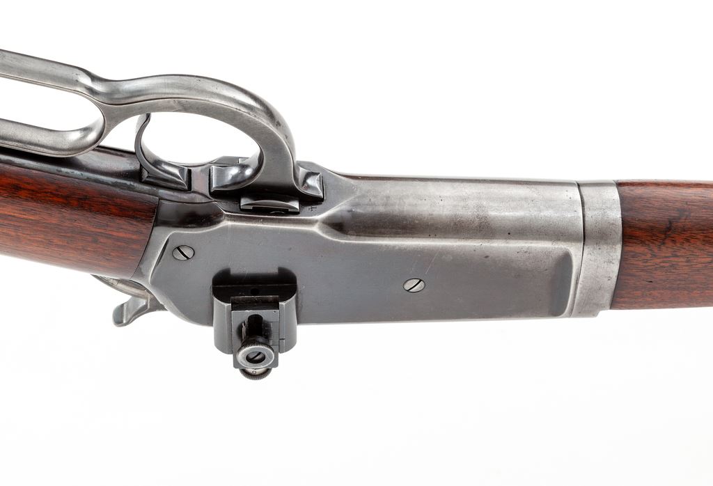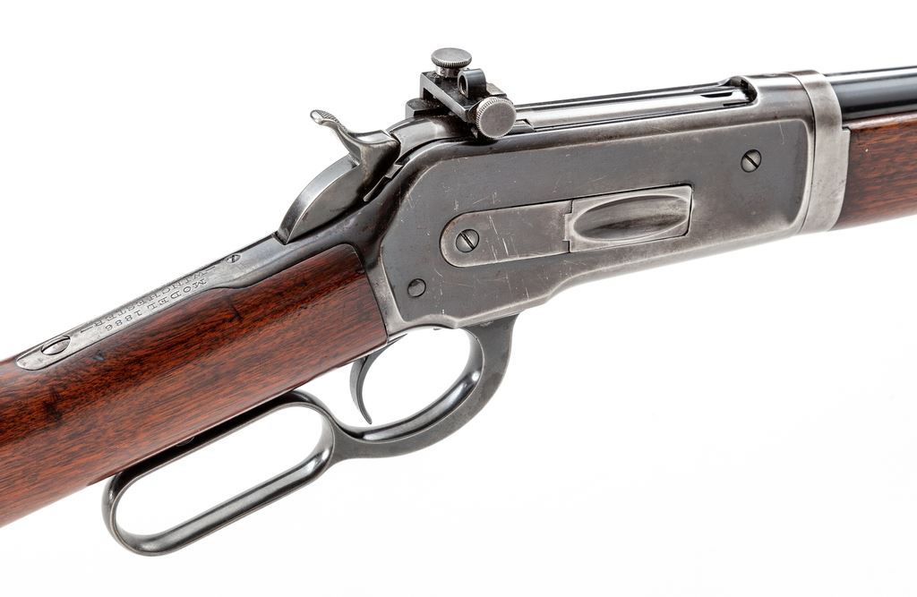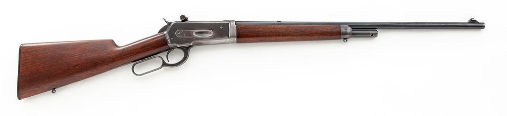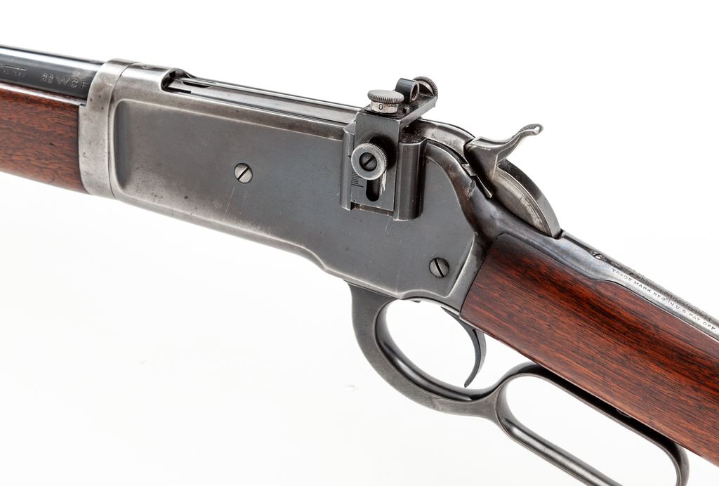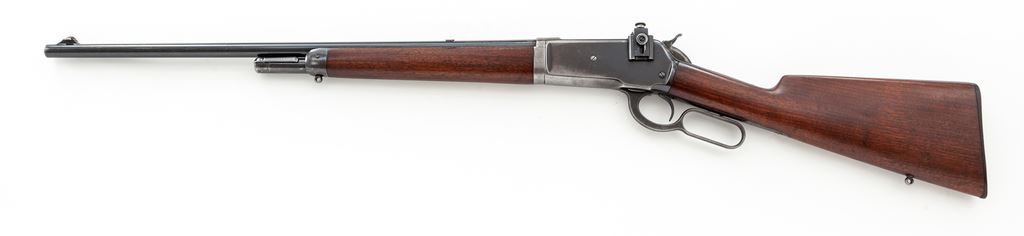 Winchester Model 1886 Takedown Lever Action Rifle, #156502, .33 WCF cal., 24'' round barrel, half mag, blue finish, walnut stock, shotgun butt and factory hard rubber buttplate, factory sling swivel eyelets, Lyman ivory bead front and receiver peep sight. No screw-in aperture. Mfg'd 1919. Condition is very good retaining approx. 80%-85% thinning blue, with most of the losses at balance point of frame. Stock with very light coat of linseed oil over just minor impressions. Good action, fine bore. Est.: $2,000-$3,000. (C& R)