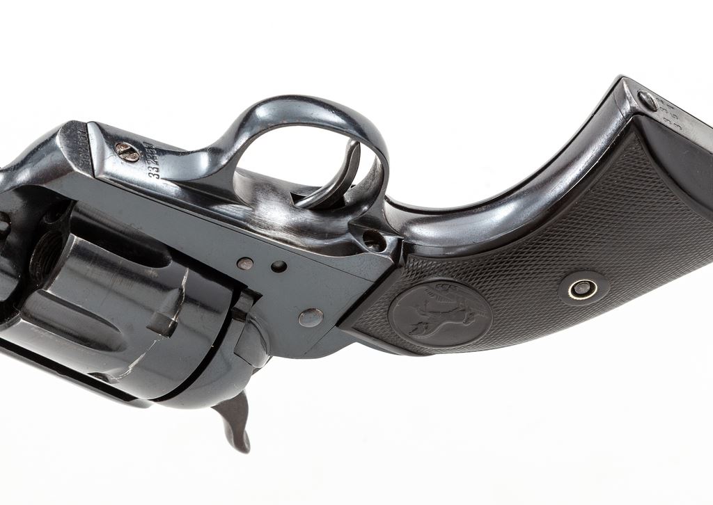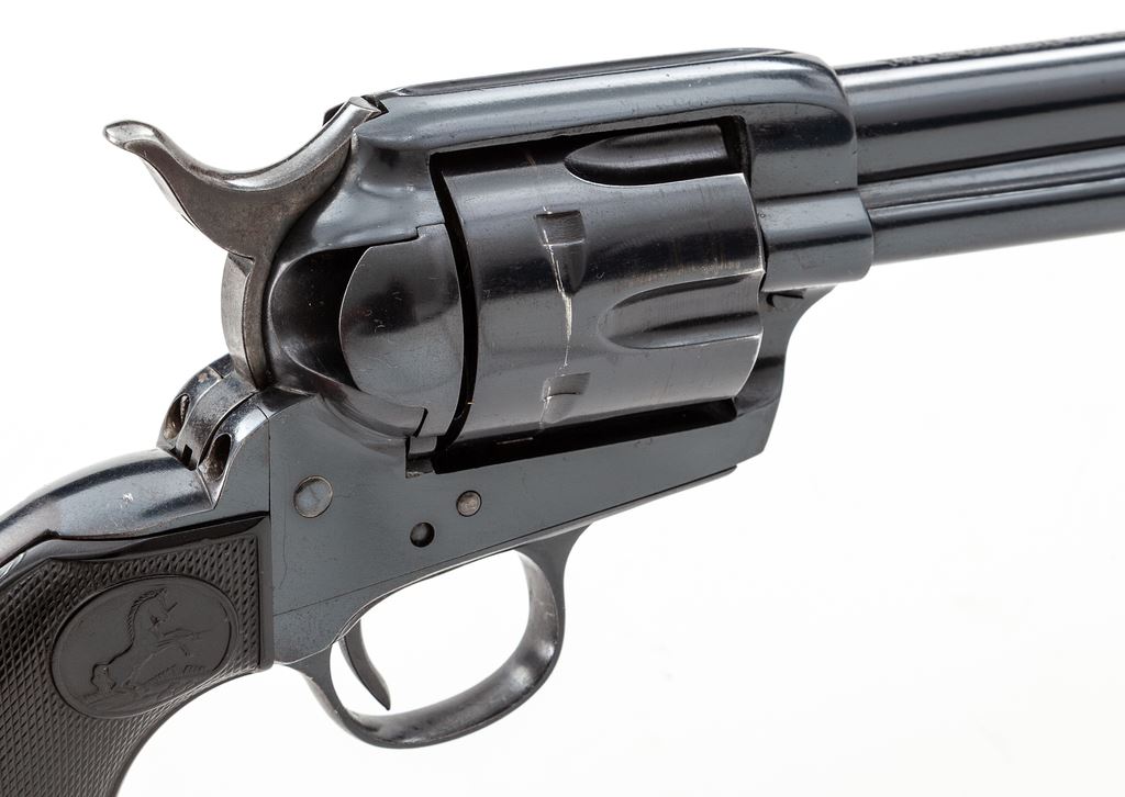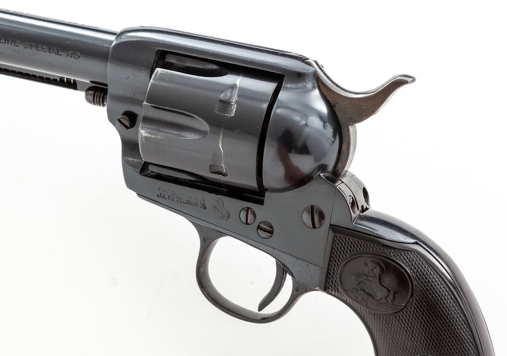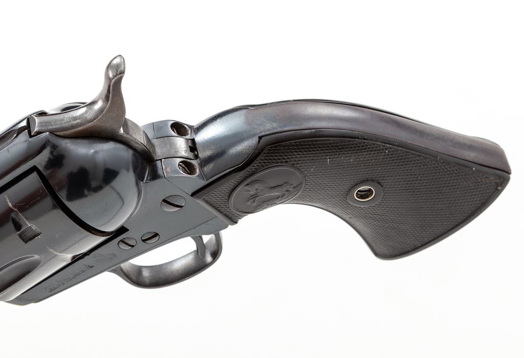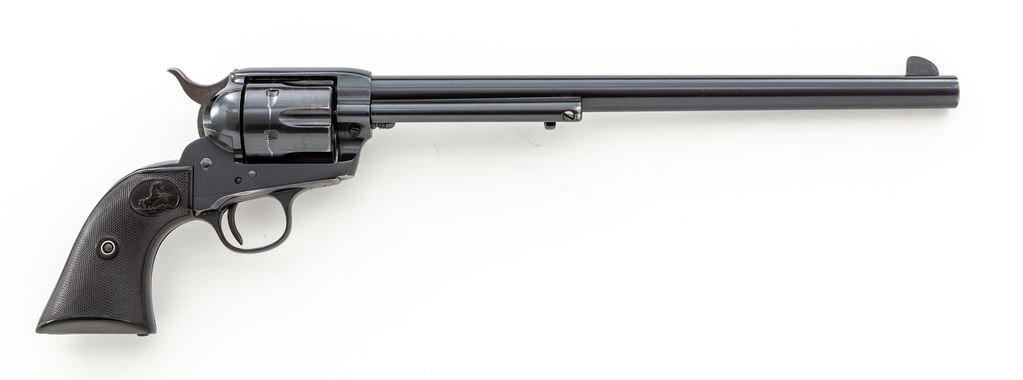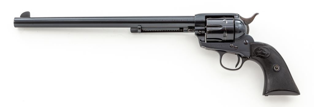 Colt Model 1873 ''Colt Buntline Special .45'' Single Action Army Cartridge Revolver, #332357, .45 Colt CF cal., 12'' round barrel with one-line ''Colt's Pt. F.A. Mfg. Co. Hartford CT. U.S.A.'' address on top and ''Colt Buntline Special .45'' on left side; left frame stamped with two-line 1871-72-75 patent dates and ''Rampant Colt'' logo, full blued finish with case hardened hammer, and steel grip straps with two-piece checkered hard rubber grips having the ''Rampant Colt'' logo in oval panel at top. A composite gun, the frame, triggerguard and backstrap mfg'd in 1916, the barrel and cylinder early 2nd Generation Colt parts circa the late 1950s. Serial numbers match on frame and grip straps; loading gate is unmarked. Condition is excellent as assembled, retaining most original barrel blue, with the exception of slight wear at left muzzle and top of front sight; possibly reblued cylinder with ''Rampant Colt'' stamping on rear face and a minor drag line; nice case hardening colors to hammer; blued trigger. Triggerguard may have been reblued, as number is slightly soft; backstrap missing original blue except at top apron and on butt. Grips are very good+, showing light wear to checkering and Colt logo and fit well. Action is crisp and sure; bore is mirror bright with sharp rifling and appears unfired. Est.: $1,500-$2,000. (C&R/PPT)