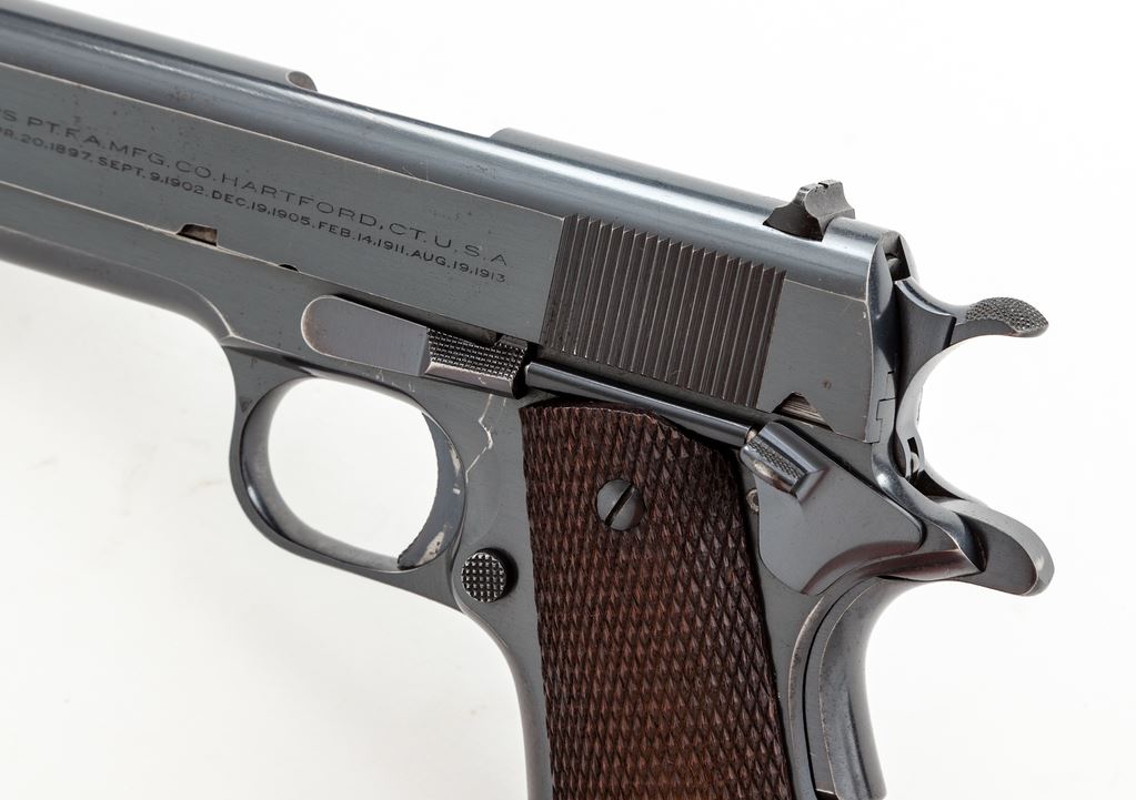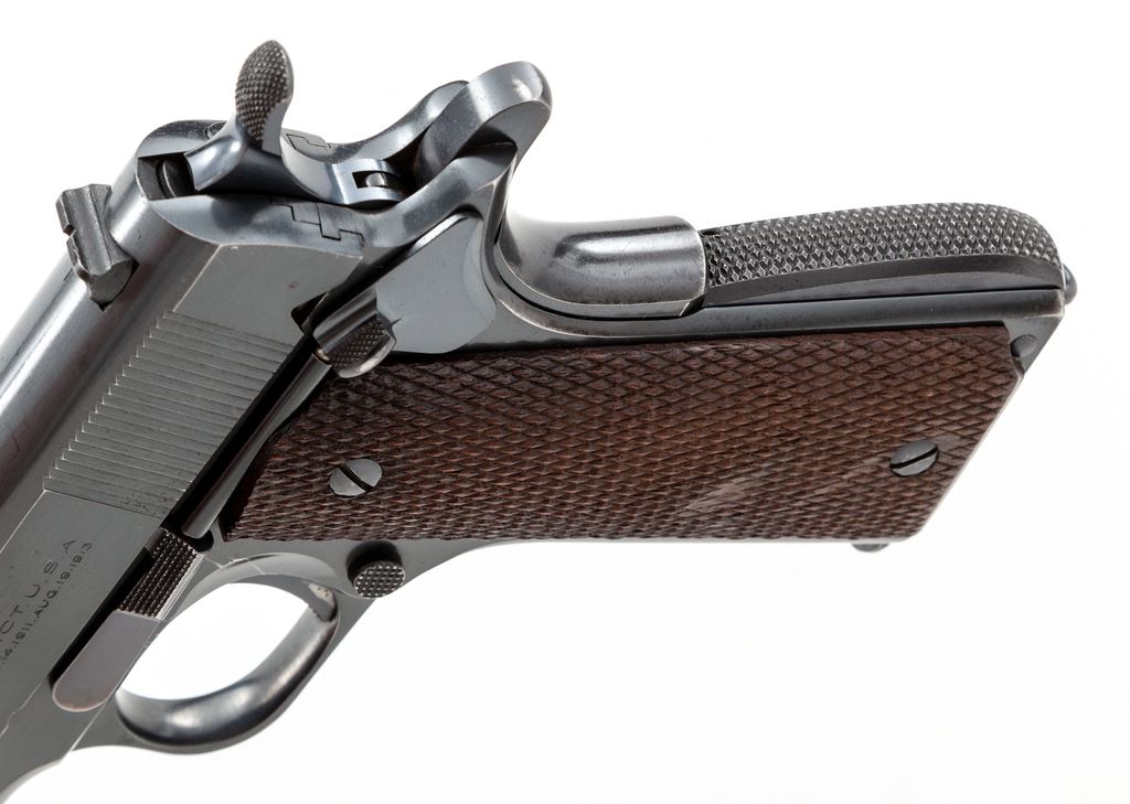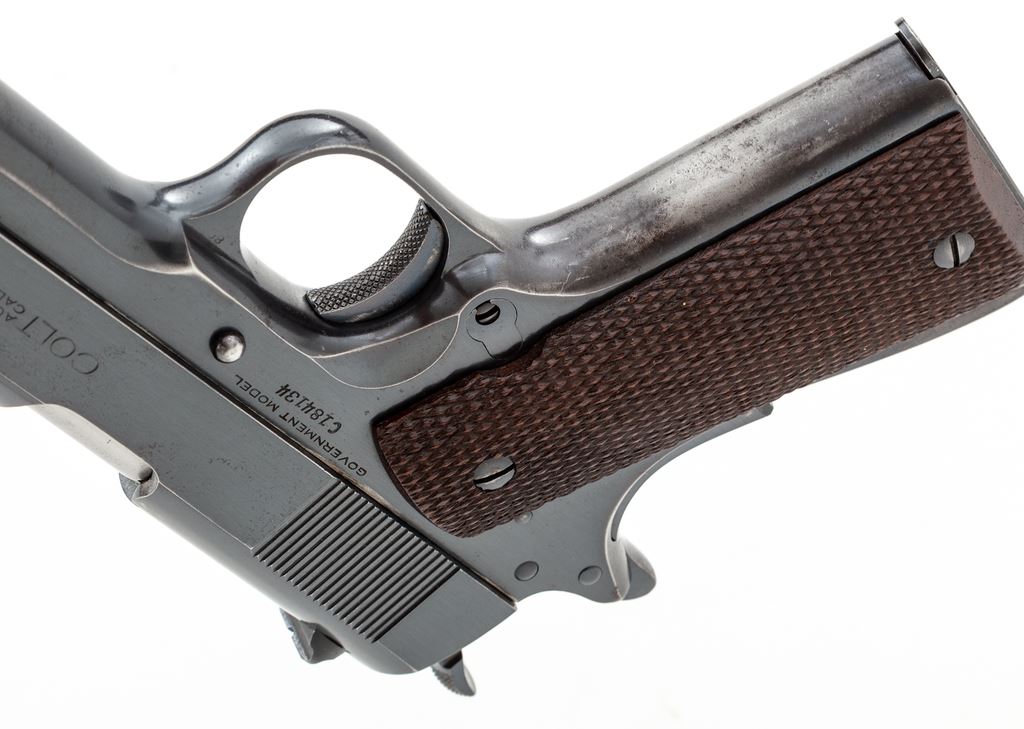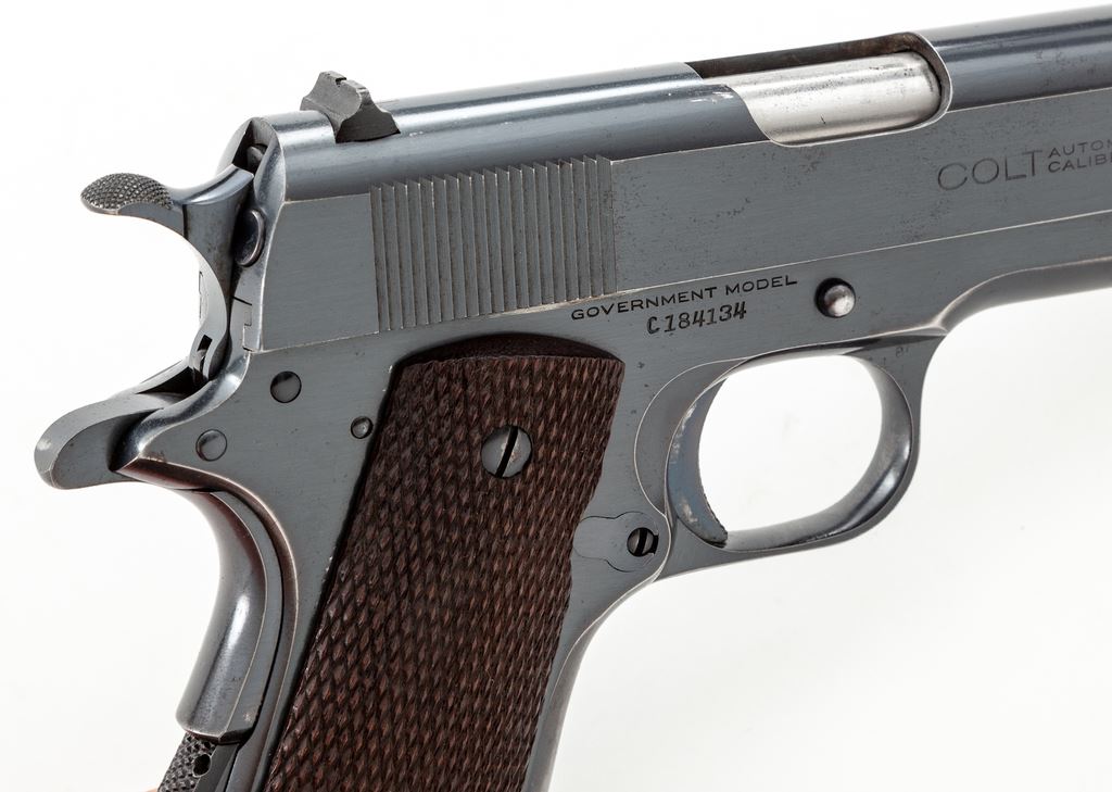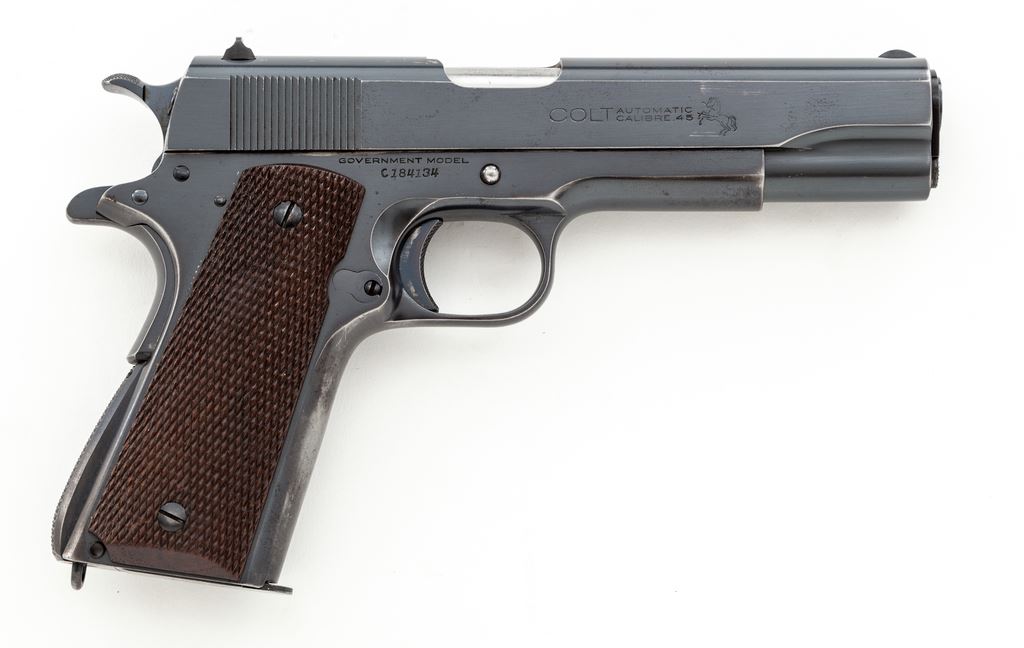 Colt Pre-War Government Model Semi-Automatic Pistol, #C184134, .45 ACP cal., 5'' barrel, blue finish, checkered walnut grips, with one correct two-tone commercial magazine marked on base plate, ''Colt/45 Auto''. Mfg'd 1937. Condition is near excellent retaining approx. 90% original blue, with highpoint wear, scratches beneath slide stop from reassembly, thinning to front strap of which approx. 30% blue remains. Original grips show thinning to checks and some bruises to left panel. Action is crisp, bore is fine. Est.: $1,800-$2,400. (C&R/PPT)