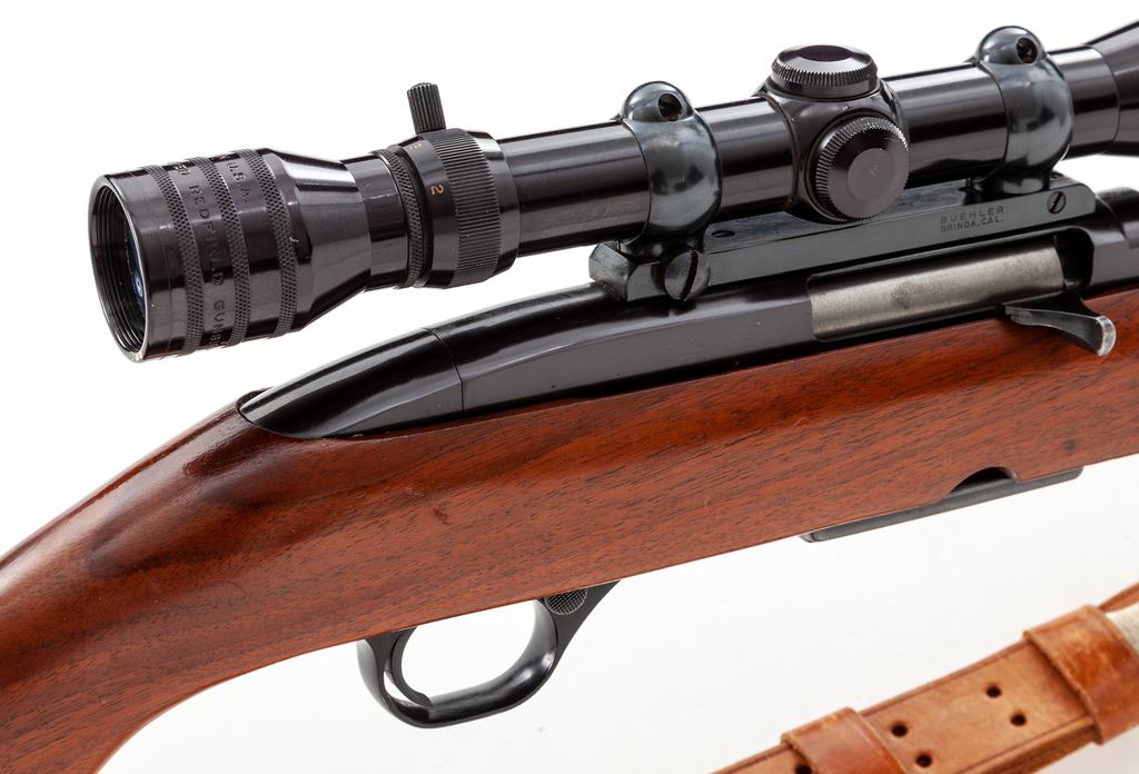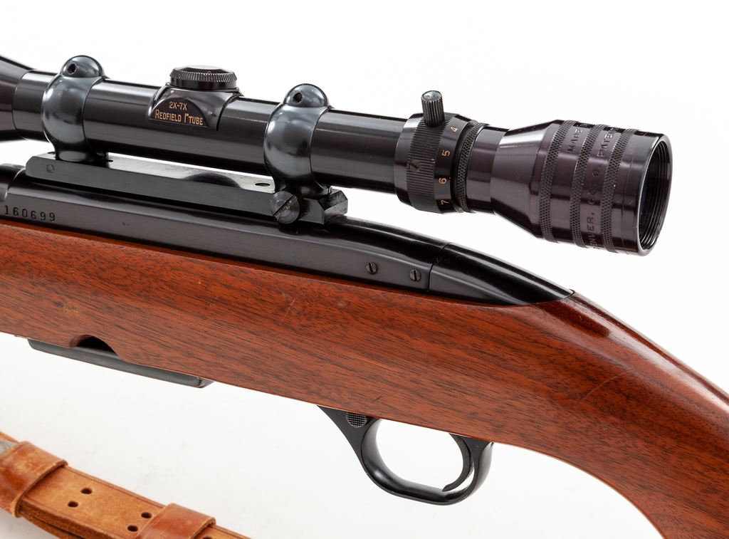 Scarce Winchester Model 100 Semi-Automatic Carbine, in .284 Win. cal., #160699, 19'' barrel, blue finish, one-piece pistol-grip walnut stock, checkered black composite buttplate, hooded silver bead front sight, folding rear sight, sling swivels, tan leather sling, and one original magazine. Topped with a Redfield 1'' Tube 2x-7x scope on one-piece Buehler mount; scope with a range-finding type fine crosshair reticle. Top of barrel and receiver are both Winchester proofed. Mfg'd 1967. Rifle is in very good overall condition and shows normal signs of moderate field use. Approx. 95% blue finish remains with plum-colored toning to the receiver; top of barrel between rear sight and receiver with some speckled oxidation; factory lettering is clear. Stock with general shallow scratches and impressions with a clear even color and finish. Action is smooth with a near excellent bore. Scope exterior is also near excellent showing only normal slight wear; optics are clear. Est.: $750-$1,000. (C&R)