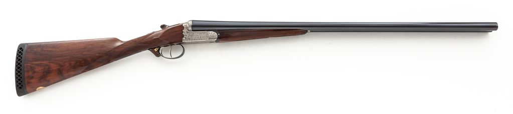 Rare Ferlib Model 7 (F.VII) High Grade Side-by-Side Shotgun, #33320. 12 ga. 28'' barrels have 2-3/4'' chambers, tapered filed concave rib, and is choked Mod./Full, with ''Ferlib Italia'' on left barrel. Action is a scalloped Anson & Deeley boxlock with dual underlugs, and features double triggers, auto ejectors and auto safety. Receiver is coin finished, with full coverage of English scroll engraving, which is signed ''A. Gobbi Inc.''. Select Grade European walnut is used on a splinter forend and straight grip buttstock, both extensively checkered at 26 lines per inch; length of pull is 14-3/4'' over black Pachmayr pad. Barrels dated 1979. Condition is excellent, with very few small handling marks to wood and metal; almost no wear to action, which locks up tight and functions perfectly; bores are bright. Est.: $5,000-$7,500. (Modern)