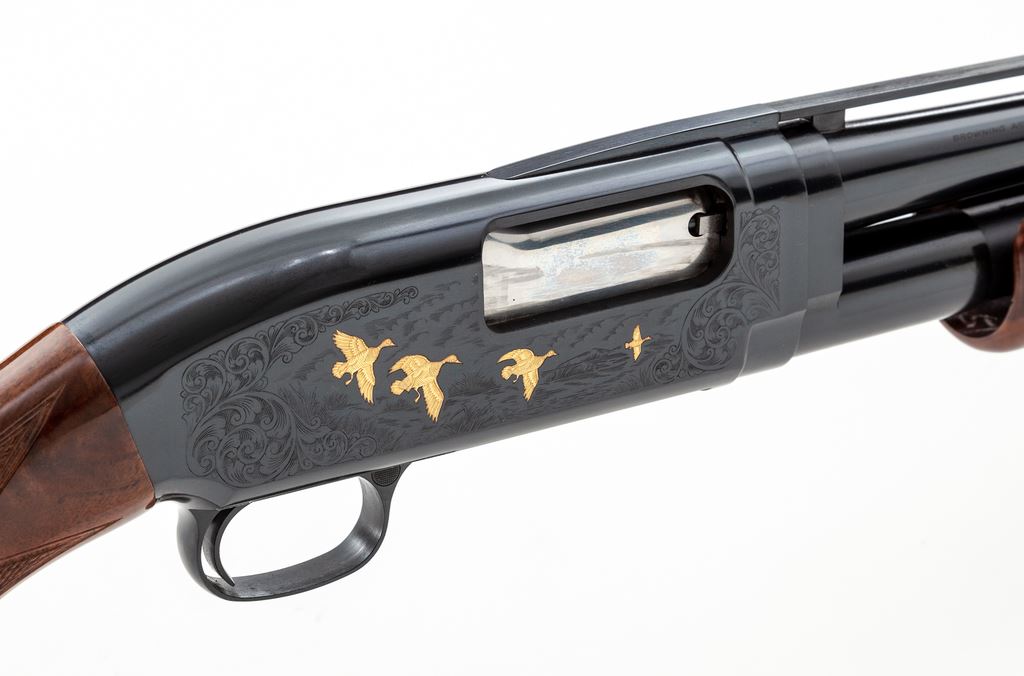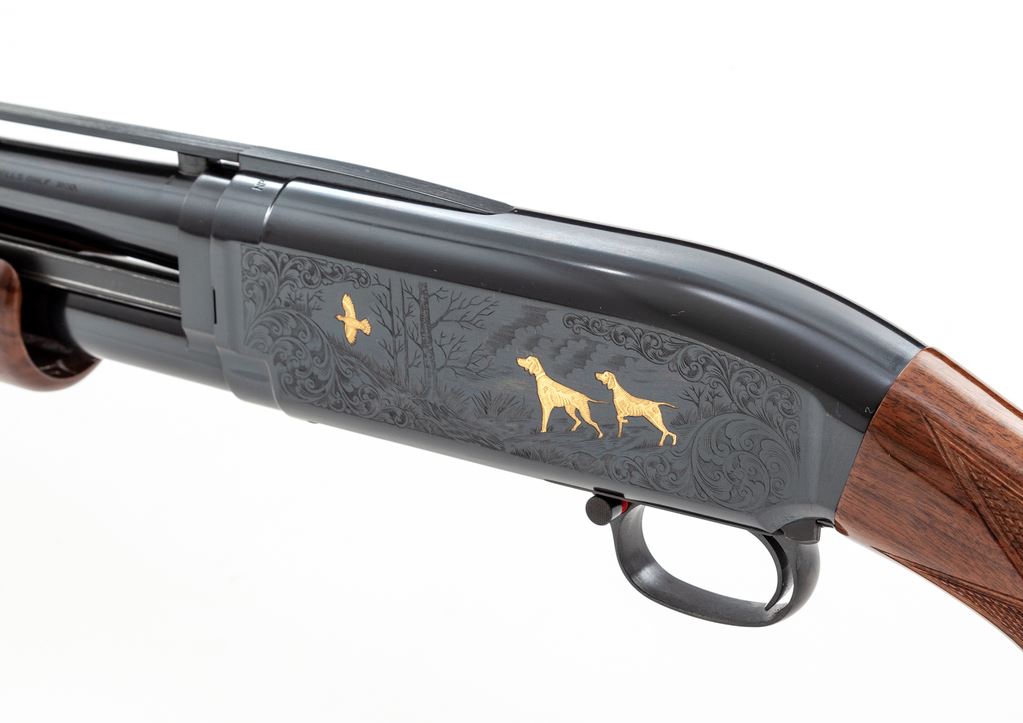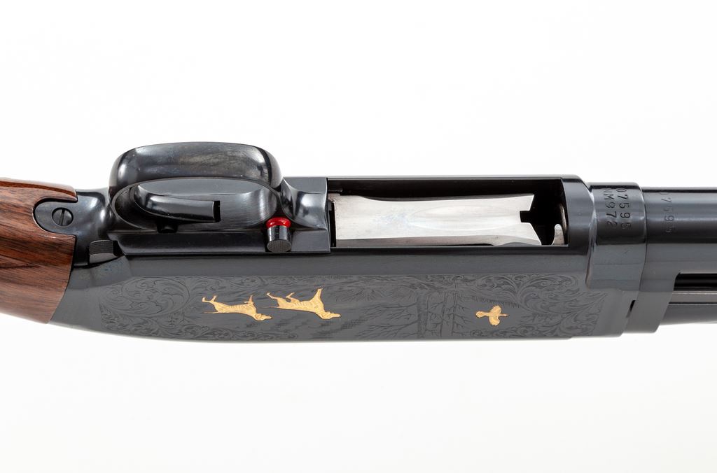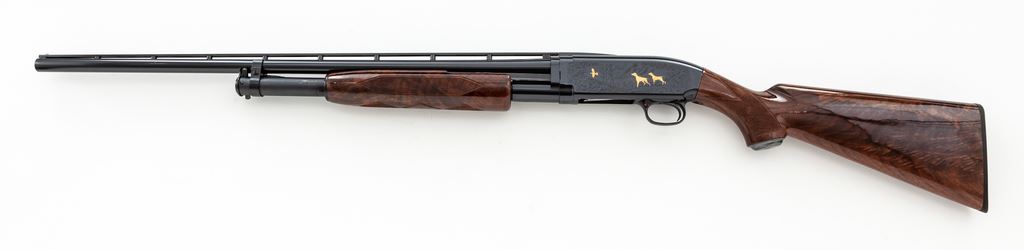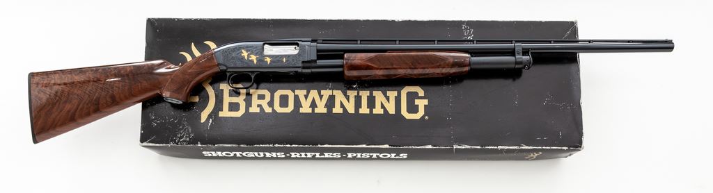 Browning Model 12 Grade V Limited Editon Slide-Action Shotgun, #07595NM972. 28 ga. 26'' vent rib barrel has a 2-3/4'' chamber and is choked Mod. Receiver has elaborate game scene engraving, with gold ducks in flight on one side and pointers flushing a grouse on the other, all surrounded by scrolls. Forend and buttstock are high-gloss Exhibition Grade walnut, with correct Winchester checkering, metal grip cap, and original Browning buttplate. All contained in original Browning box serial numbered to the gun, with original paperwork. Mfg'd 1990 by Miroku in Japan for Browning. Condition is as new, in original box, appearing unfired. Est.: $1,300-$1,700. (Modern)