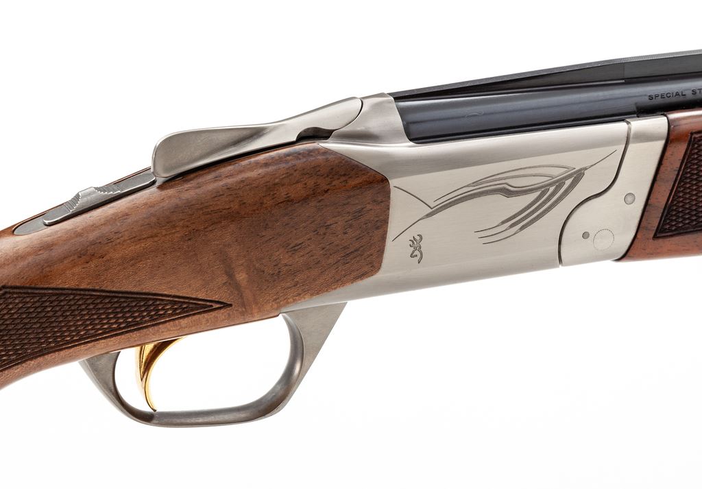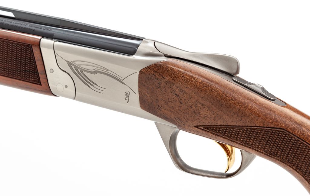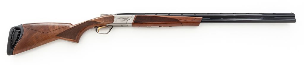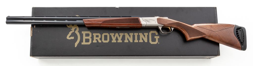 Browning Cynergy Field Grade Over/Under Shotgun, #05882MV132, 28 ga. 28'' barrels have 2-3/4'' chambers, vent rib with target beads and Invector chokes (F,M,IC included). Action has single selective trigger, auto ejectors and non-auto safety. Receiver is silver nitride finished to reduce corrosion, with distinctive Browning logo/design. Standard Grade walnut forend and pistol-grip buttstock are specially designed to fit with low receiver profile. Still enclosed in its original box, with stock spacer, extra choke tube and wrench, and all Browning paperwork. Mfg'd 2005. Condition is as new in box, possibly having been fired but otherwise new. A great new concept in over/under design. Est.: $800-$1,200. (Modern)