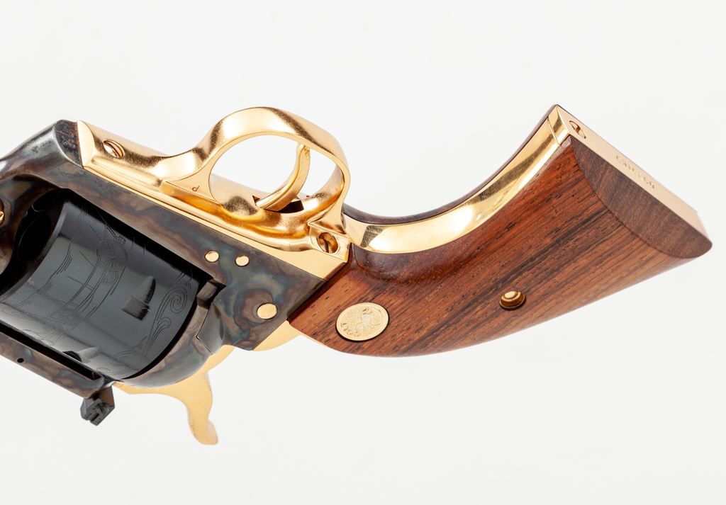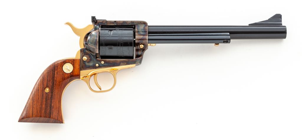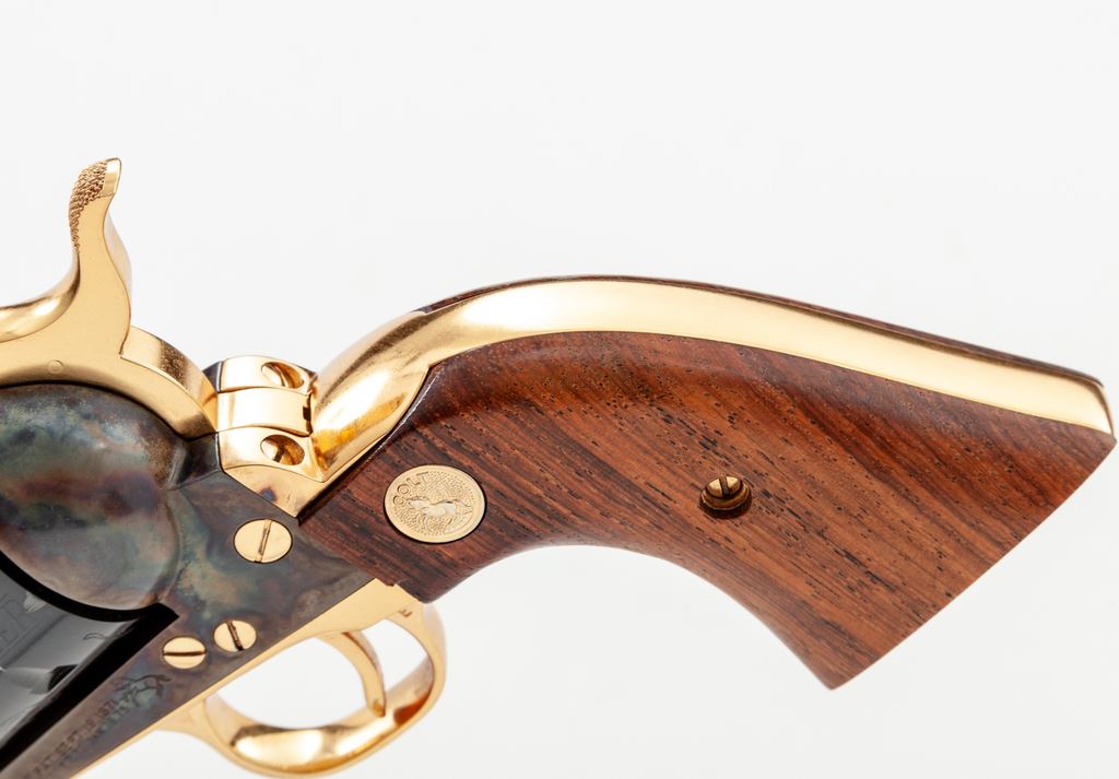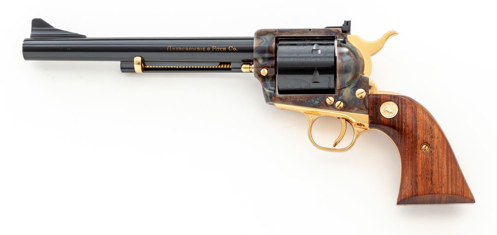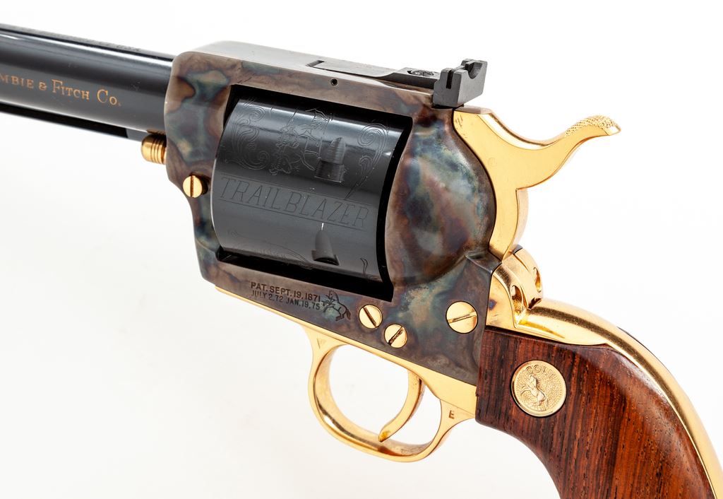 Colt Commemorative Abercrombie & Fitch Chicago Trailblazer Single Action Army Revolver, #291, .45 LC cal., 7.5'' barrel, blue and gold-colored finish, color case hardened frame, smooth walnut grips with gold Colt medallions, fixed blade front sight and adjustable rear sight. Cylinder is lightly engraved and marked ''Trailblazer''; butt is stamped ''Chicago''. Left side of the barrel is marked in gold lettering ''Abercrombie & Fitch Co.'' Revolver is in excellent condition; cylinder appears unturned. Ejector rod housing shows a few small handling marks. Front edge of left grip with a shallow impression, otherwise this revolver is as new and appears unfired, with beautiful case colors and nice bright gold colors. Only 100 of these handguns were mfg'd in 1966. Est.: $1,000-$1,400. (C&R)(Sierra Sid's Casino, Sparks, NV.)