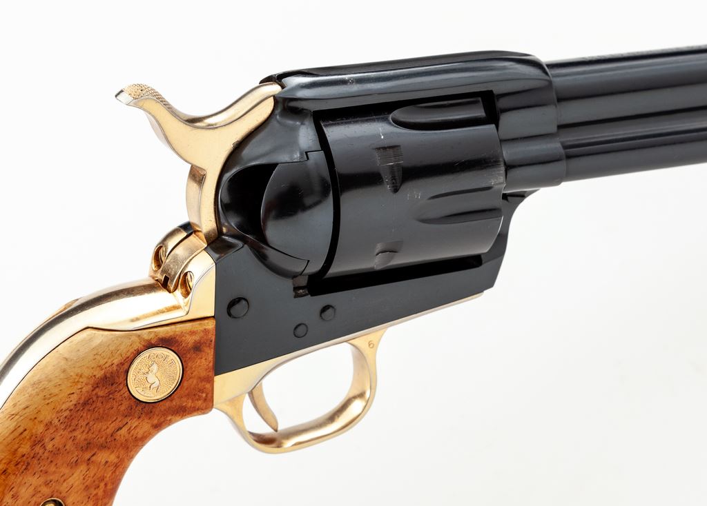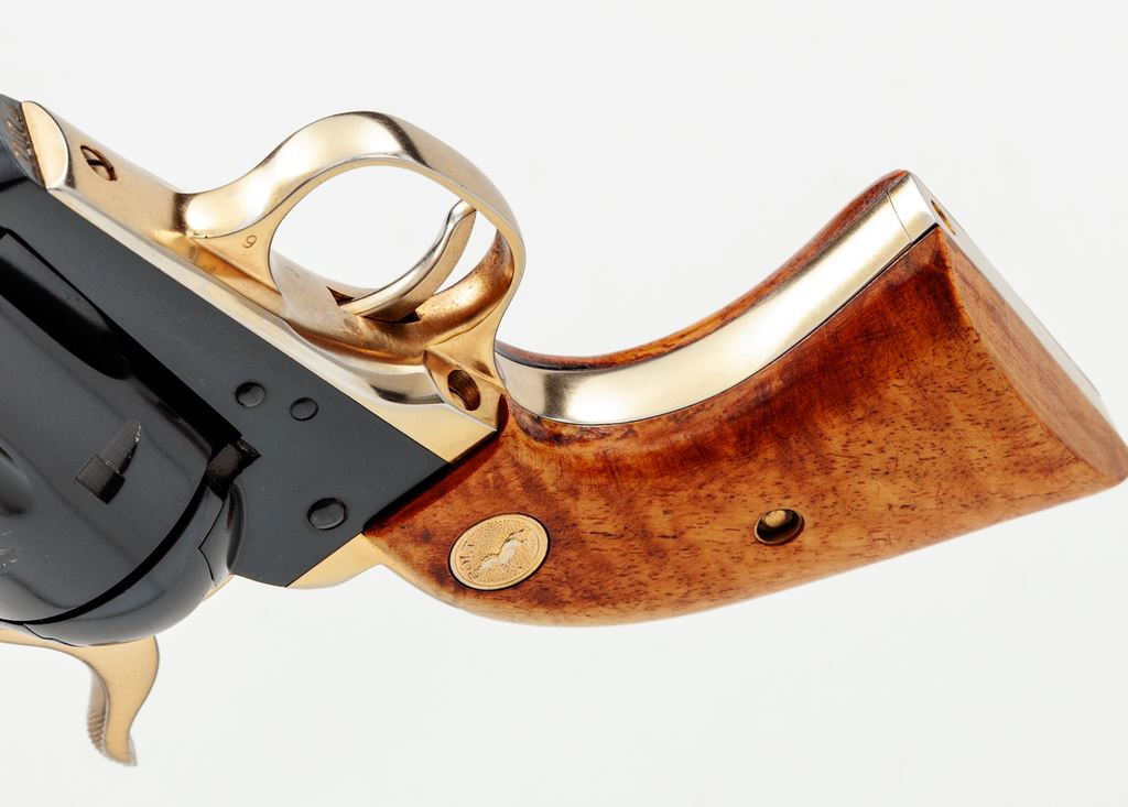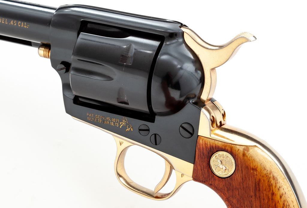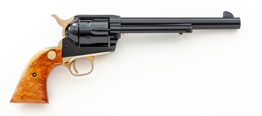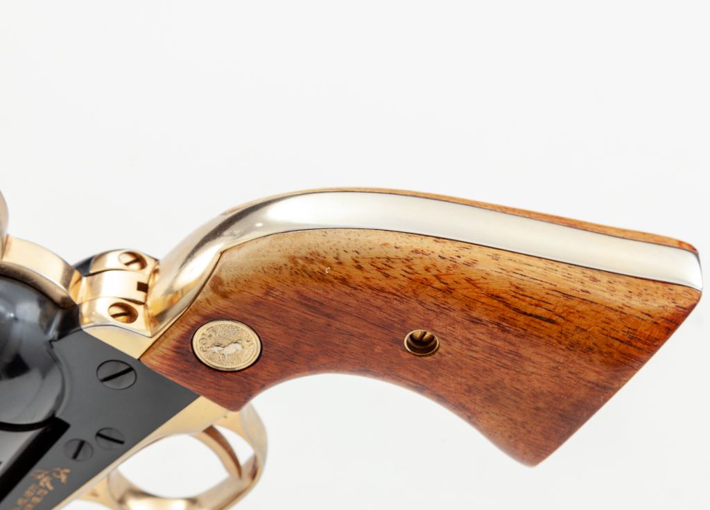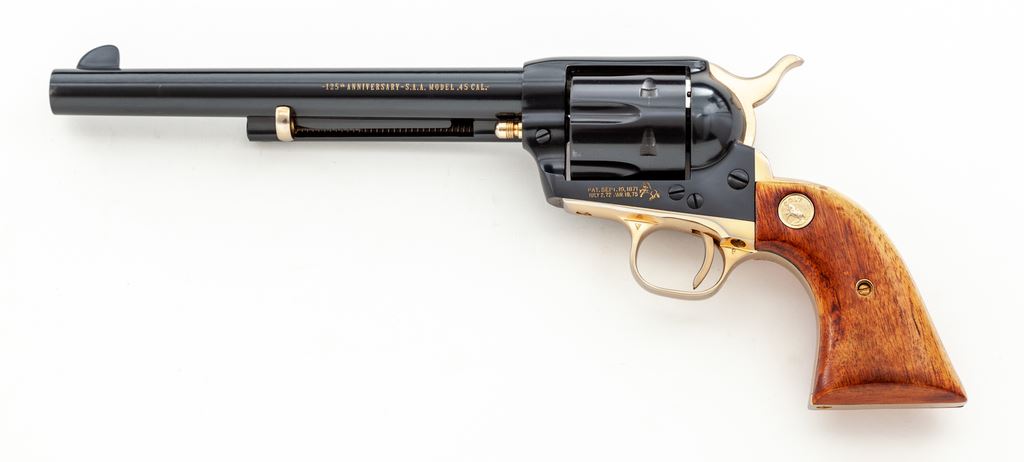 Colt 125th Anniversary Commemorative Single Action Army Revolver, #7107AM, .45 LC cal., 7.5'' barrel, dark blue and gold colored finish, smooth wood grips with gold Colt medallions, and standard fixed sights. Factory lettering has been highlighted in gold; left side of barrel reads ''-125th Anniversary- S.A.A. Model .45 Cal.'' Grips are light in color from being on display in the casino, but this revolver is in otherwise excellent overall condition. Metal retains approx. 99% original blue finish with some scattered minor handling marks; cylinder with a slight index line and a few spots of concentrated micro-scratching. Grips with intermittent shallow handling marks. Factory lettering is clear. Bright bore is like new. 7,390 of these revolvers were mfg'd in 1961. Est.: $800-$1,200. (C&R)(Sierra Sid's Casino, Sparks, NV.)