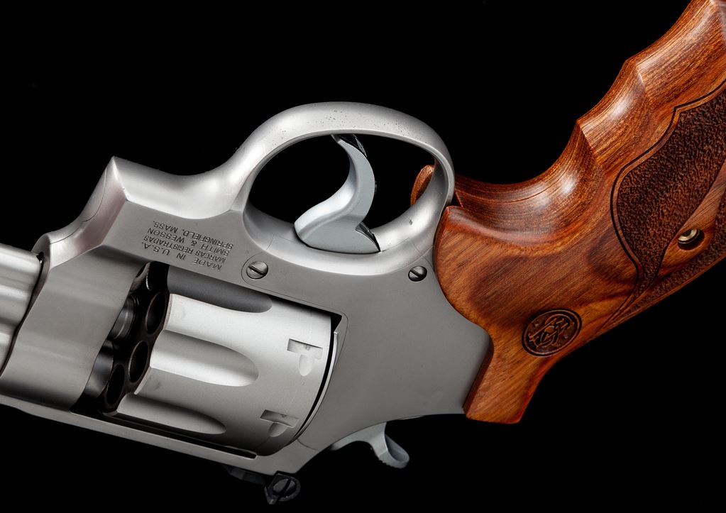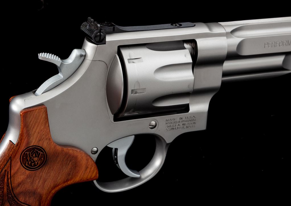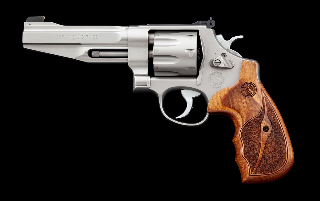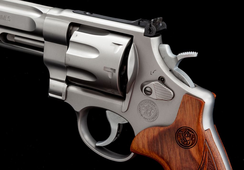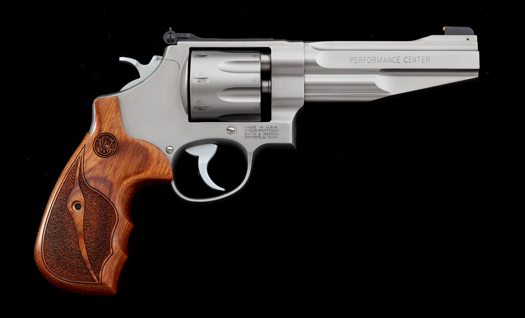 Smith & Wesson Performance Center Model 627-5 Double Action Revolver, #CVT8700, .357 mag. cal., 5'' contoured barrel with tapered lug, 8-shot cylinder, stainless steel finish, factory laminate wood grips with laser engraved S&W logo, gold bead Patridge front sight, and adjustable square notched rear sight. Left side of barrel is marked ''.357 MAG - 8 TIMES'', right side ''PERFORMANCE CENTER''; left side of frame with the S&W ''Performance Center'' logo. Cylinder with a little powder staining and a light index line, otherwise this revolver shows only minor handling marks and rates as excellent overall. Grips appear as new. Factory lettering with crisp edges. Action is smooth with an excellent bright bore. Est.: $800-$1,200. (Modern/PPT)