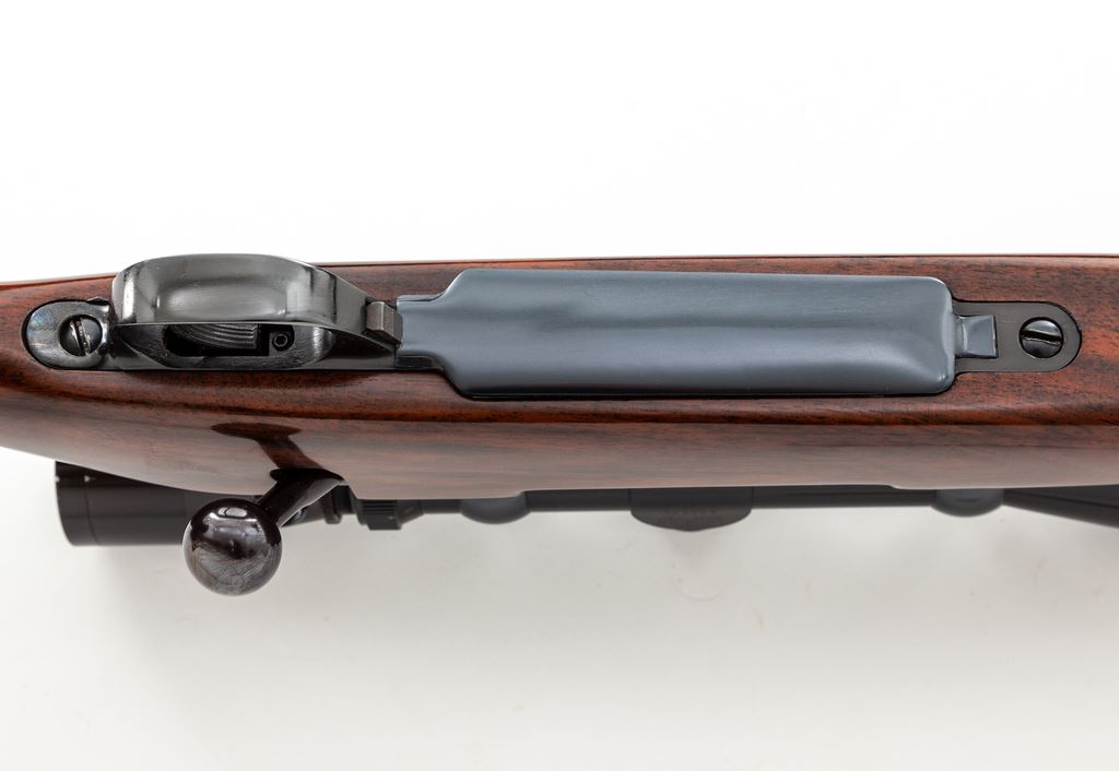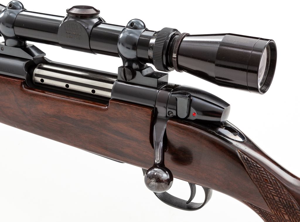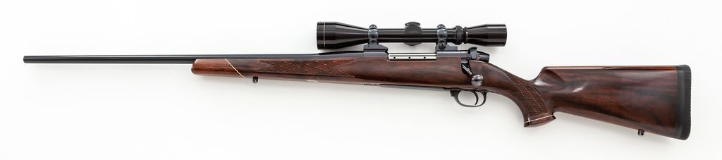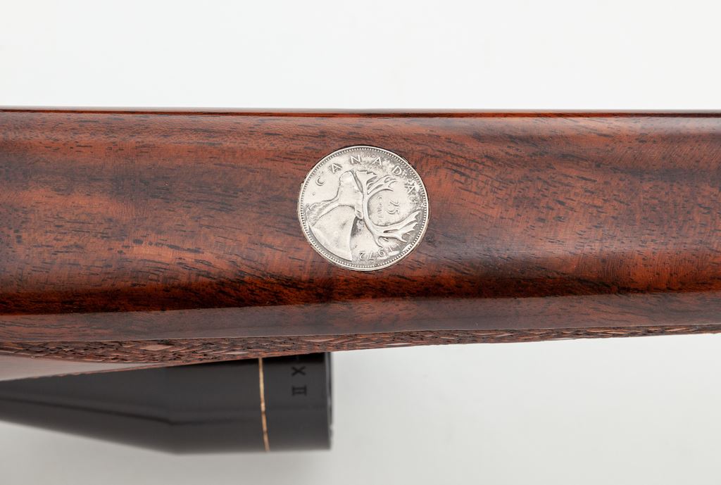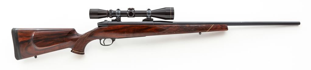 Left-Hand Weatherby MK V Bolt Action Rifle, with Leupold scope, #H76716, .240 Wea. mag. cal., 24'' barrel, royal blue finish, factory skip-line checkered walnut stock with white-spaced rosewood pistol and forend cap. Topped with an early Leupold 3x9 Vari-X II scope on Buehler rings and mounts. This Japanese made Weatherby retains approx. 97% original blue, thinning at muzzle and at magazine floorplate; triggerguard screw shows very light wear and thinning at slot edges. Magazine well exhibits polished ramp area. With inlaid silver Canadian 25-cent piece to lower portion of stock and added Pachmayr butt pad and spacer, giving an overall length of pull at 13.5''. Early Leupold scope with minor scuffs from field use, but still exhibits clear optics thru its crosshair reticle. Smooth action, bright bore. Est.: $800-$1,200. (Modern)