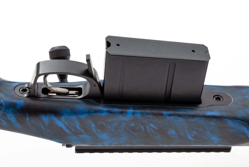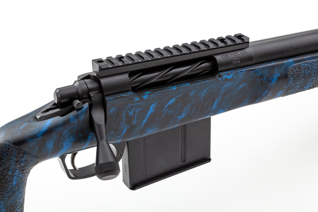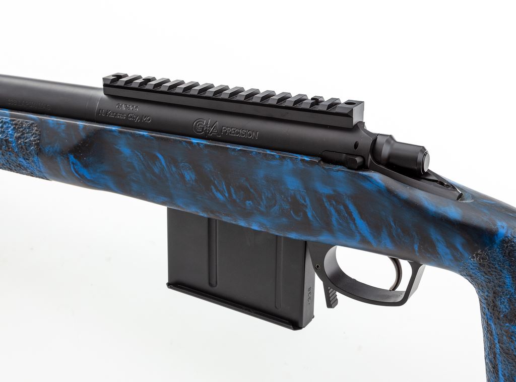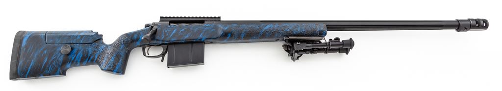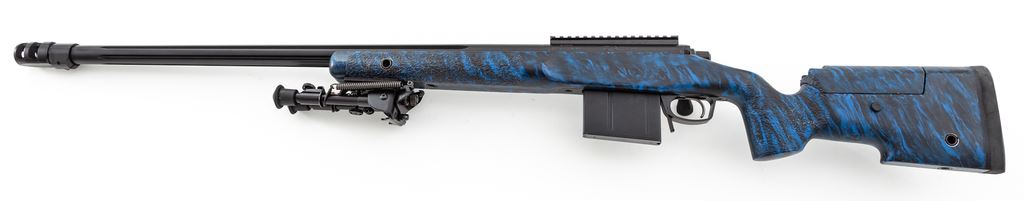 Outstanding Custom GA Precision Bolt Action Rifle, #GAP806, .338 Lapua Magnum, Templar action, 26'' fluted GA Precision barrel, 28'' overall including muzzlebrake, with matte black Cerakote finish. Stock appears to be a McMillan A5 tactical stock with blue and black marble pattern finish, adjustable cheekpiece, and black rubber Decelerator recoil pad. Also featuring a one-piece scope base, Harris S-BR bipod, paddle style magazine release, and three (3) Accuracy International magazines. Overall this rifle is in as new condition. Cheekpiece shows some minor insignificant specks of wear to the finish, otherwise this rifle shows little evidence of being handled or fired. Action is smooth; bore is excellent. A great opportunity to buy one of these rifles without the custom build lead time. Est.: $3,000-$4,000. (Modern)