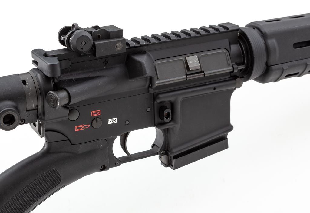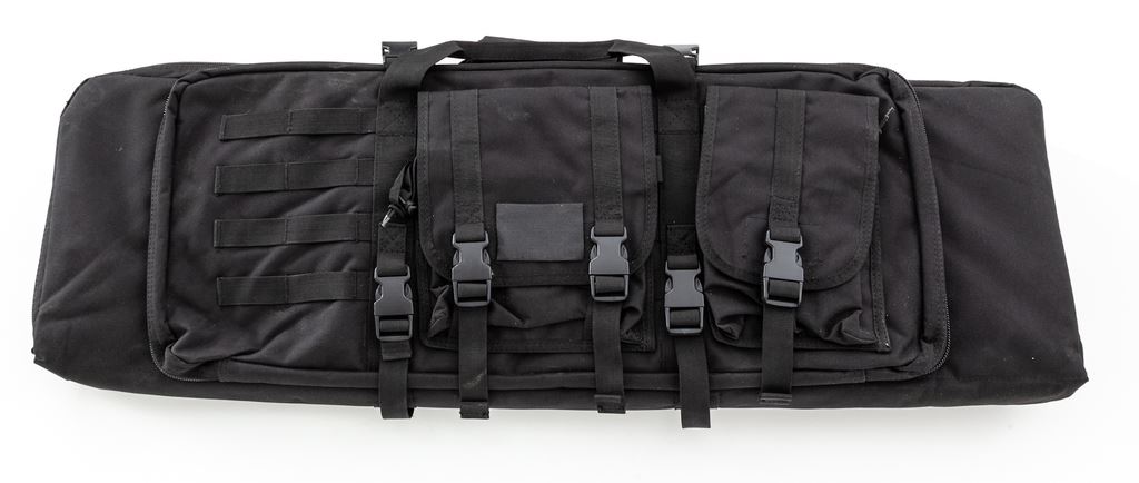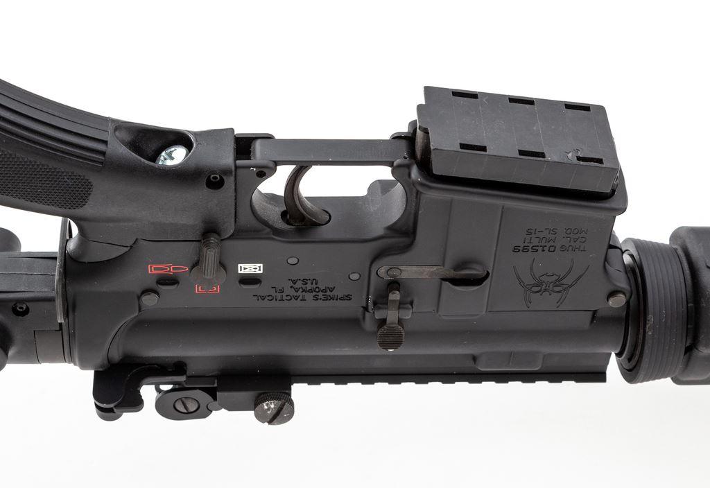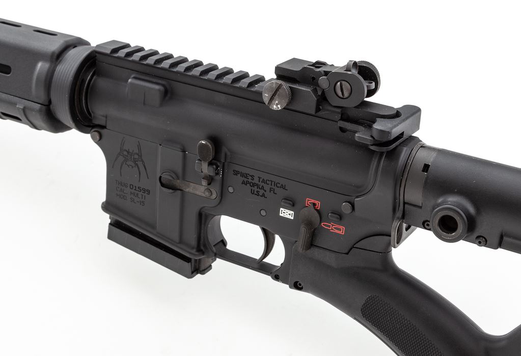 Spike's Tactical Model SL-15 THUG Semi-Automatic Rifle, #01599, 5.56 cal., 16'' barrel, 18'' overall including muzzlebrake, matte black finish, black Magpul handguard, black Thordsen Customs stock, flip-up sights, and one unmarked plastic 10-round magazine. Included is a black padded Molle range bag. In near excellent overall condition, showing normal scattered scuffs to the stock and matte metal surfaces. Sights show light wear to the highpoints. Excellent smooth action and bright bore. Est.: $600-$900. (Modern)