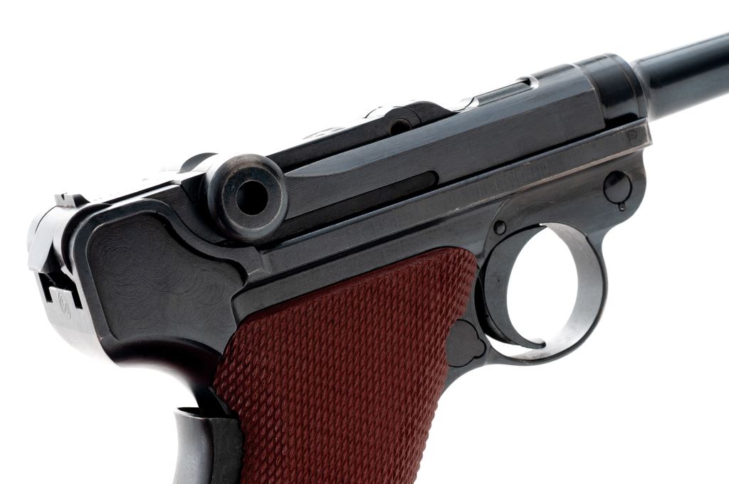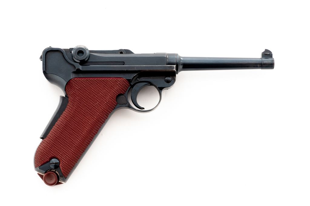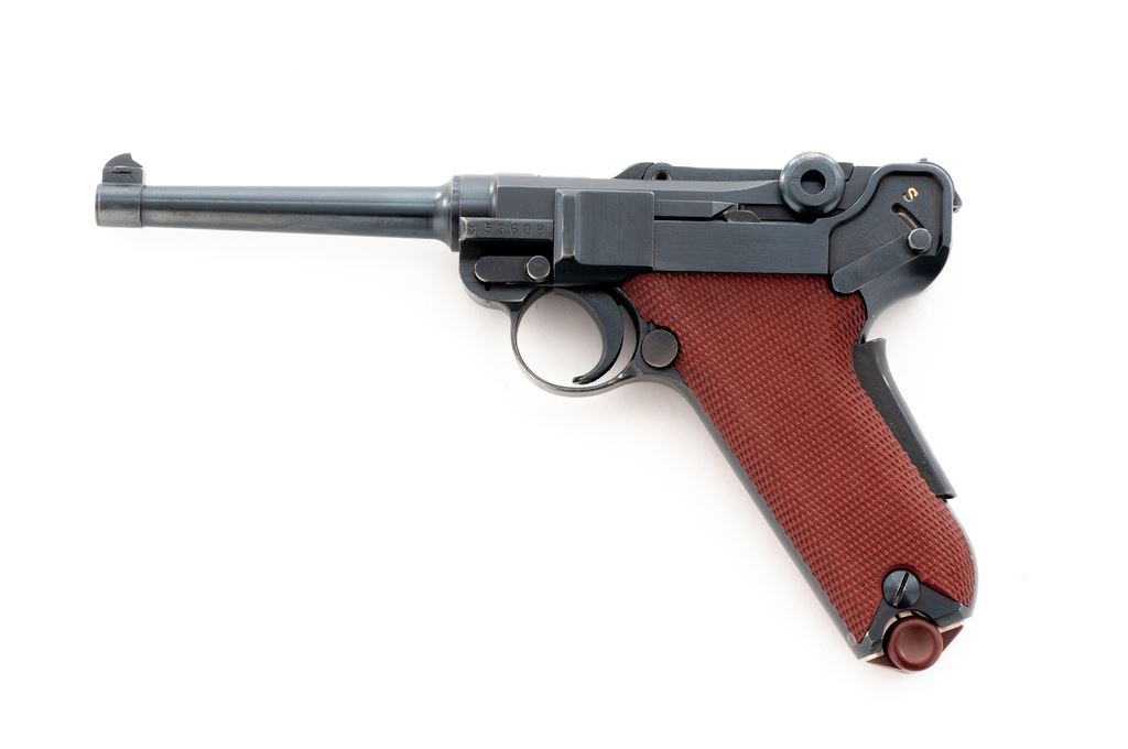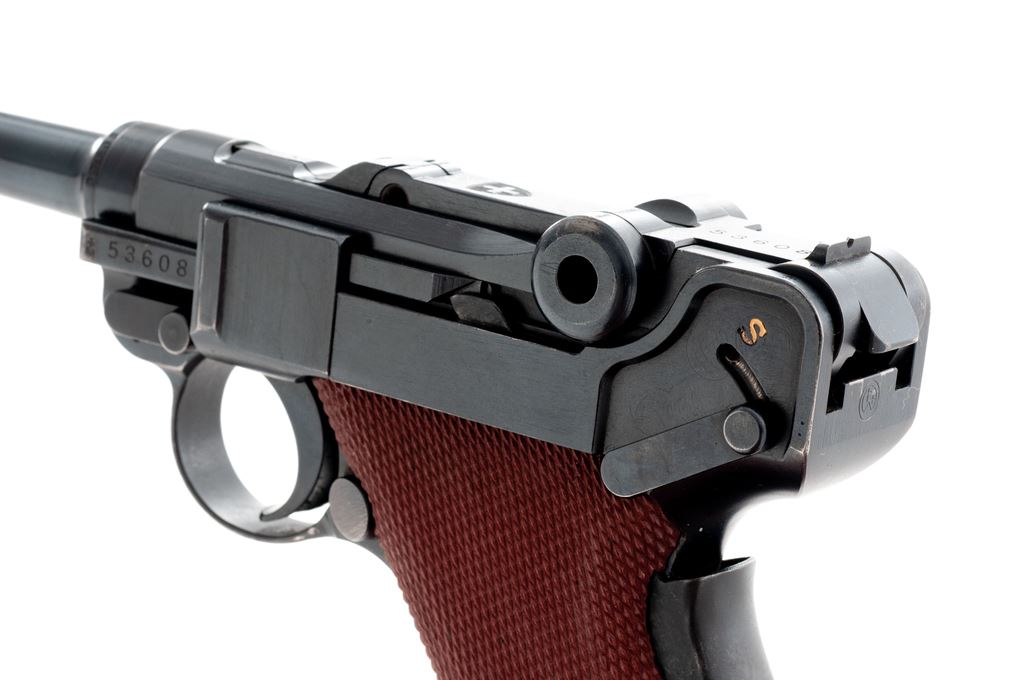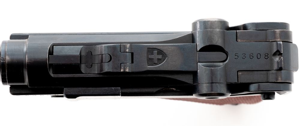 Swiss Military Model 1929 Luger Semi-Automatic Pistol, #53608, .30 Luger cal., 4-3/4'' barrel, blue finish, red/brown molded checkered plastic grips, with one correct unmarked tin-plated magazine. Condition is excellent with light thinning to forward edges, retaining approx. 98% original blue, with minor scratch to bottom of triggerguard from holster. Crisp grips, tight factory action, and bright bore. Est.: $1,000-$1,500. (C&R/PPT)