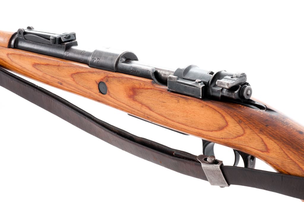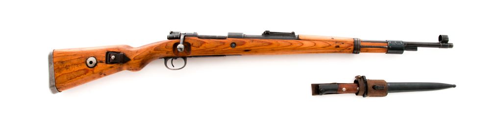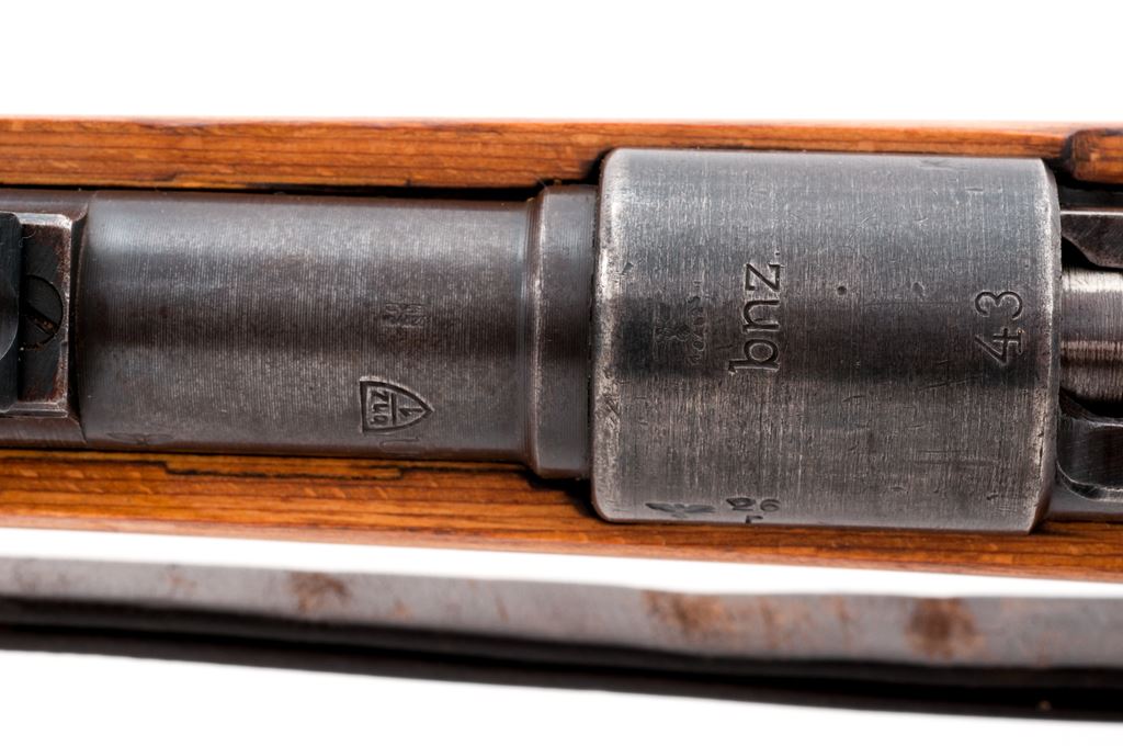 German Kar98k Mauser Bolt Action Rifle, with bayonet, #26r, 8x57mm cal., 23.6'' barrel, blued finish, laminated stock with cupped buttplate, inverted ''V'' front sight with added protector and adjustable tangent rear sight. Marked on receiver ring with the Steyr factory code ''bnz'' and ''43''. Stamped on barrel with ''bnz/1'' within shield along with ''bn''. ''WaA 623'' Waffenamt inspection stamps on receiver and barrel. Right side of buttstock has faint inspection stamp and ''H'' stamp signifying German army (Heer) ownership. Mismatched numbers on bolt; matching numbers on rear sight, floorplate, and triggerguard. Condition overall is very good with approx. 75% thinning blue remaining on metal surfaces. Wood has been sanded and refinished with a flat satin over old handling marks and is in very good condition. Action is smooth, bore is very good showing some frosting and wear at the throat. Includes a period Kar98k leather sling in good condition with a replaced keeper. The Yugoslavian made bayonet is stamped in Cyrillic characters ''NPEAY3EKE 44'' and does not lock down fully onto the mounting bar. Matching numbers on bayonet and scabbard (73126). Condition is excellent with light wear to scabbard. Includes a leather frog in good condition with name carved onto rear. No visible import stamps. Est.: $500-$800. (C&R)