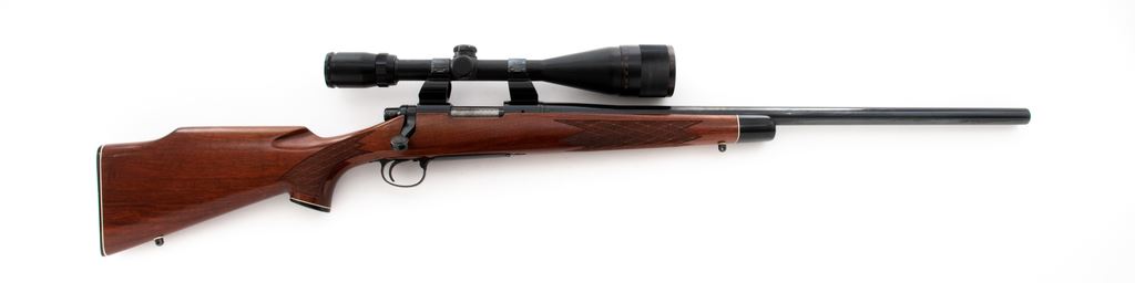 Remington Model 700BDL Deluxe Bolt Action Rifle, with Bushnell scope, #B6431471, .223 Rem. cal., 24'' heavy barrel, blue finish, hinged floorplate, rear sight has been removed and muzzle is not tapped for a front sight; plug screws for the rear sight are not present. One-piece walnut stock with gloss finish, skip-line checkering at the pistol grip and forend, Monte Carlo cheekpiece, black forend cap, black composite buttplate and grip cap. Fitted with a Bushnell Banner 6-18x50 wide angle scope on 1'' Weaver rings; scope with duplex reticle. Metal surfaces rate as near excellent with approx. 98% original blue finish, showing a small amount of scattered light handling marks. Stock is very good and retains nearly all of the original gloss finish, with signs of moderate field use including scattered shallow impressions and rub marks. Action is smooth with an excellent bright bore. Scope is excellent and shows only minor wear to the exterior, optics are bright and clear. Est.: $500-$750. (Modern)
