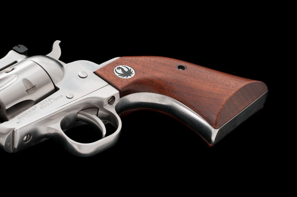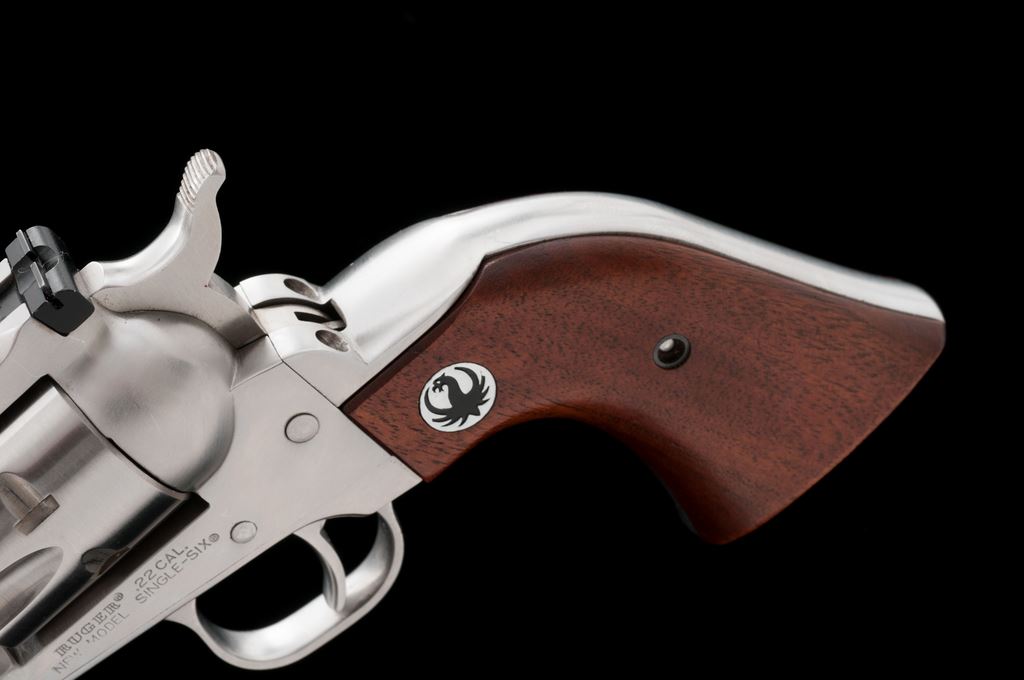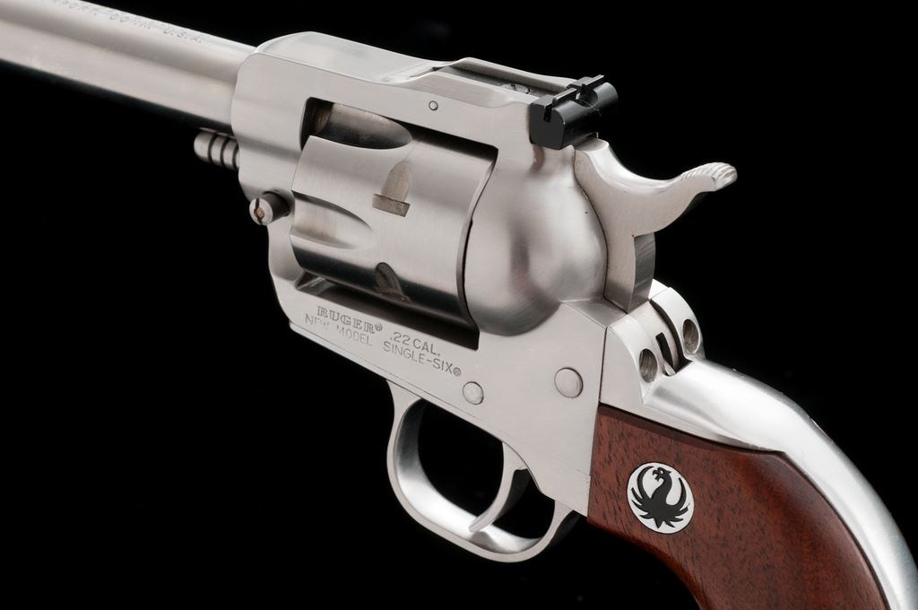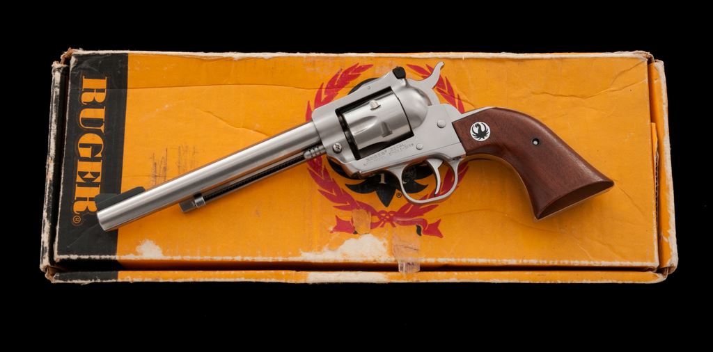 ''Star'' Marked Ruger New Model Super Single-Six Single Action Revolver, #63-77422, .22 LR cal., 6.5'' barrel, stainless steel, smooth walnut grips with black Ruger medallions, fixed blade front sight and fully adjustable square notched rear sight. Bottom of frame in front of the triggerguard with a small ''star'' stamp; mfg'd in 1975. In a one-piece Ruger box that lacks any sort of firearm identification. Metal rates very good showing signs of moderate use and handling, including scattered micro-scratching and small handling marks. Grips are excellent with only a few insignificant handling marks. Action is smooth and crisp with a bright bore. Box shows considerable age and wear. Est.: $350-$550. (Modern/PPT)