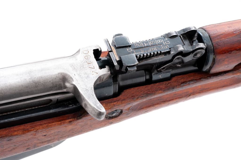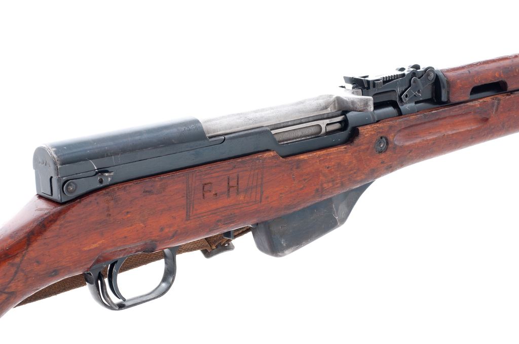 Albanian SKS Semi-Automatic Rifle, with folding bayonet, #06074-70, 7.62x39mm cal., 20.5'' barrel, blue finish, hardwood stock and upper handguard, hood post front sight and tangent rear sight, folding spike type bayonet, and what looks like a correct unmarked period sling. Complete with cleaning rod and buttstock cleaning kit. Bottom of barrel is import marked. All externally numbered parts are matching including the stock. Metal surfaces are very good with approx. 80% blue finish, showing general thinning and wear. All factory numbering is clear and well defined. Wood is good with an added coat of varnish over general surface dings and mars; right side below the receiver with the initials F.H. carved into the surface; stock is solid. Bayonet functions properly. Action is smooth with a bright bore; rifling is near excellent showing only light wear. Sling shows moderate soiling and wear. Est.: $400-$600. (Modern)