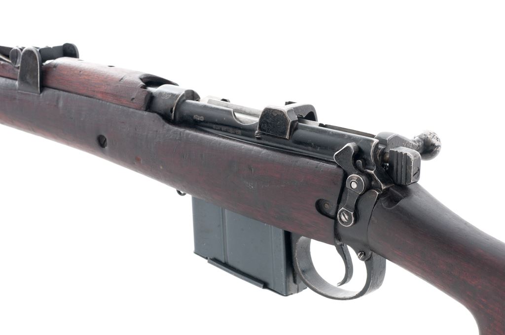Indian 2A1 Lee-Enfield Bolt Action Rifle, #K6430, 7.62x51mm cal., 25.2'' barrel, blued/painted finish, hardwood stock, blade front sight with protective ears and adjustable leaf rear sight. Marked on right side of action body with faint ''(ASHOKA symbol)/RIFLE 7.62 mm 2A1 R.F.I. 1966''. Rear sight leaf marked ''ICR 1559 R.F.I''. ''SA'' cartouche on right side of buttstock. Matching numbers on bolt handle, rear sight leaf, and nose cap. No serial numbers on forend. Magazine case is unnumbered and may be an aftermarket replacement. Includes one additional 10-round reproduction magazine. Condition overall is very good with metal surfaces retaining approx. 80% finish, with wear on the bolt. Wood is very good with a few impressions and handling marks on the forend. Bright bore is excellent. Action closes stiffly - rifle headspace should be checked. Import stamped on left side of receiver. Est.: $350-$450. (C&R) (High-cap mags not available to Calif. residents.)