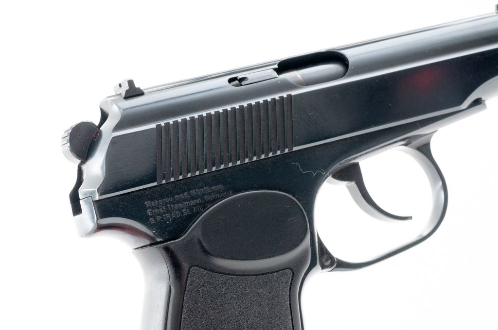 East German Makarov Semi-Automatic Pistol, by Ernst Thalmann, #AY7545, 9mm Makarov cal., 3-5/8'' barrel, dark blue finish, wraparound black hard rubber grips, standard fixed sights, with one magazine. Frame and slide with visible matching numbers. Right side of frame is import marked; left side is dated ''61''. Metal surfaces retain approx. 98+% blue finish and are excellent overall; slide with intermittent small handling marks. Grips are like new. Action is smooth and tight; mirror bright bore rates excellent and appears to have been fired very little. Est.: $300-$500. (C&R/PPT)