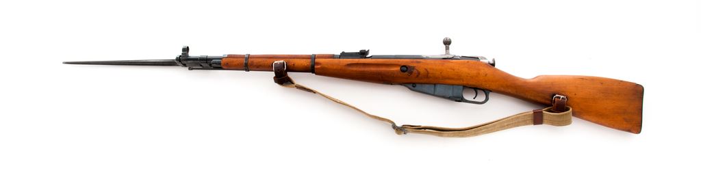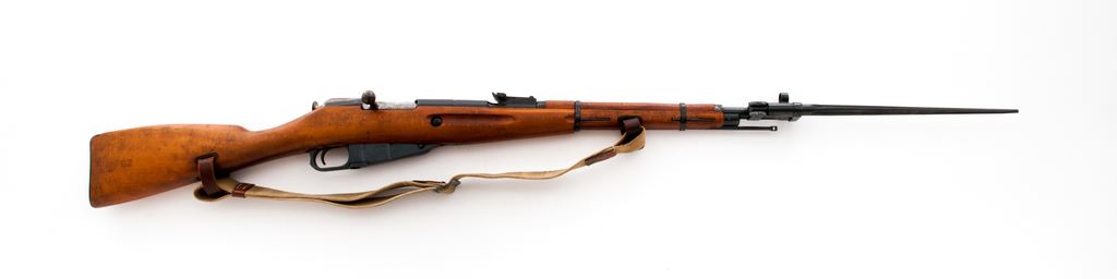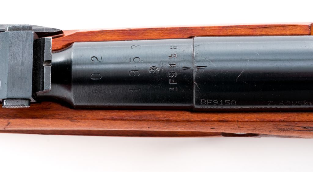 Hungarian M44 Mosin-Nagant Bolt Action Carbine, with side folding bayonet, #BF9158, 7.62x54R cal., 20.25'' barrel, blued finish, wood stock, hooded post front sight, adjustable tangent rear sight, cleaning rod, and canvas sling with leather collars. Hungarian marked on barrel shank, with ''02'' country code, and dated ''1953''. Right side of buttstock with the number ''02'' and ''(circle)B''. Externally numbered parts are matching. Left side of receiver is import marked. Condition overall is very good with approx. 93%-95% blued finish remaining on metal surfaces; triggerguard with some very fine pitting. Stock with normal shallow impressions and handling marks; left side near the reinforcing bolt with what looks like several wood dowel type repairs and a hairline crack that is still visible; stock is solid. Factory lettering is mostly clear. Action is smooth; bright bore rates near excellent with a small amount of very minor frosting in the grooves. Bayonet is excellent and operates smoothly. Sling shows moderate age and wear. Est.: $150-$300. (C&R)