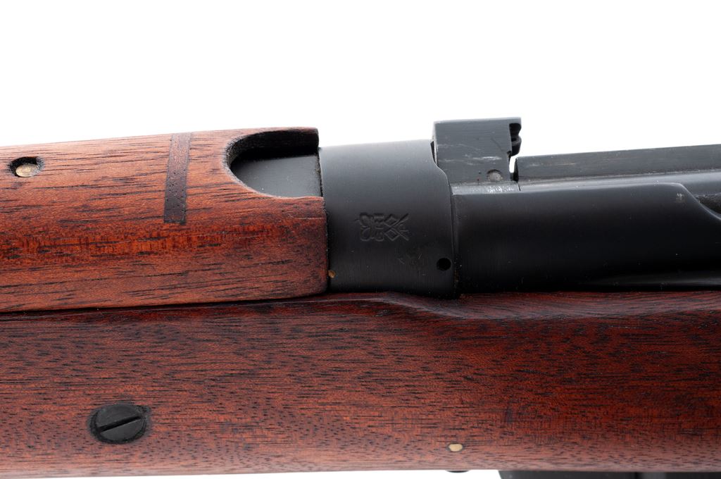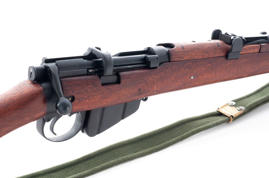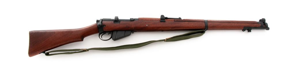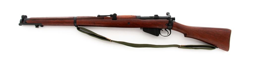 Indian No. 1 Mk 111* Lee-Enfield Bolt Action Rifle, #69487G, .303 Brit. cal., 25.2'' barrel, blued finish, hardwood stock, blade front sight with protectors and adjustable leaf rear sight. Marked on right side of action body ''(crown)/G.R.I. 1943 No.1 MK111*''. Transverse screw through forend. Forend is not numbered, other numbers are matching. Replaced firing pin. Includes a green cotton military sling. Condition overall is very good with metal surfaces retaining approx. 95% of its reblued finish. Wood has been sanded and refinished showing a number of handling marks. Action is smooth, bore is excellent. No visible import stamps. Est.: $300-$400. (C&R)
