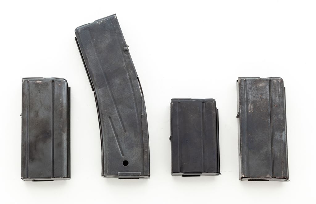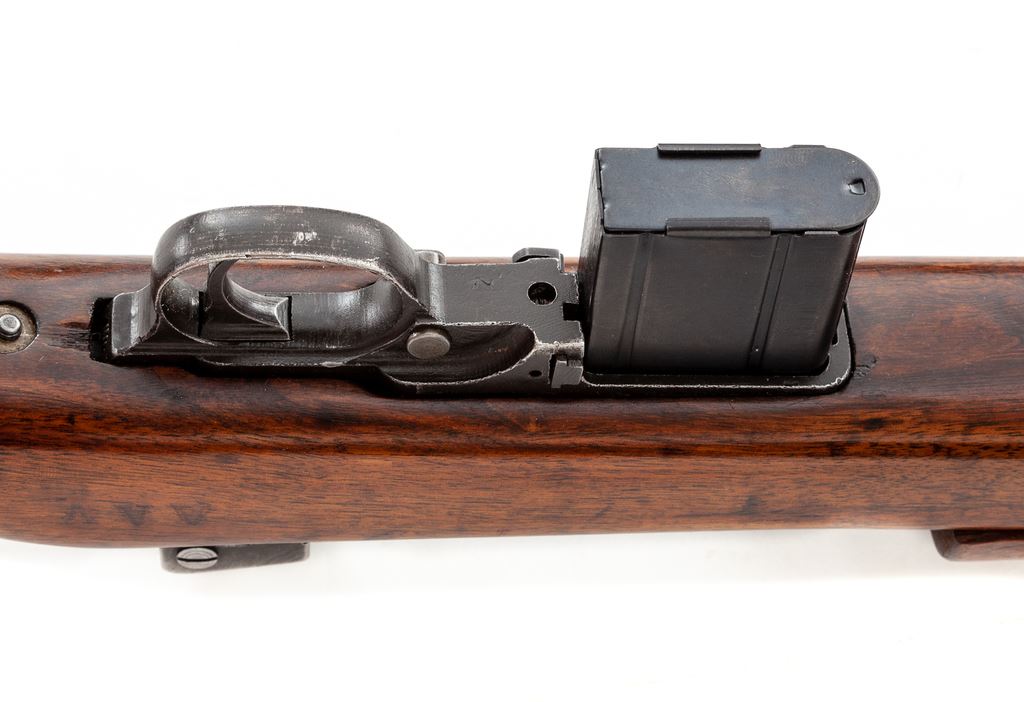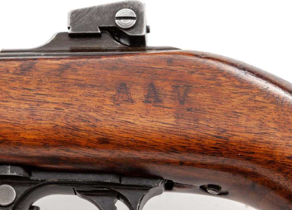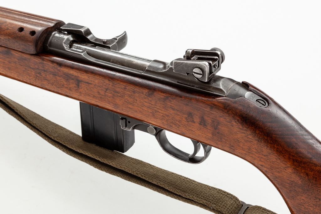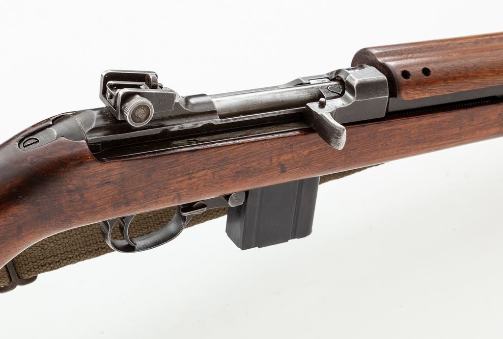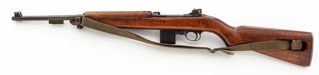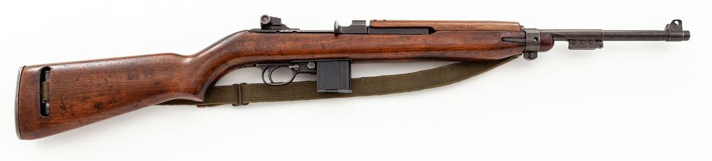 Saginaw M1 Semi-Automatic Carbine, #2064069, .30 Carbine cal., 18'' barrel, parkerized finish, walnut stock. Marked on chamber ''U.S. CARBINE CAL..30 M1'', and on receiver tang ''STD.PRO.'' Barrel behind front sight is marked ''SAGINAW S.G.DIV. GENERAL MOTORS''. Left side of stock is stamped with a faint ''AAV'', and right side buttstock has a faint unreadable boxed cartouche. ''M'' stamp on magazine release. Round bolt. Condition overall is very good, with approx. 70% finish remaining on the metal and the balance thinned bright. Wood is very good and has been sanded with a varnish finish applied over old scratches and handling marks. Action is smooth, bright bore is very good. Includes a U.S.G.I. green cotton sling and two U.S.G.I. 15-rd. magazines stamped ''SP-SG'' and ''UN'' and three aftermarket magazines, all in good condition or better. Est.: $700-$1,000. (C&R)(High-cap mags not available to Calif. residents.)