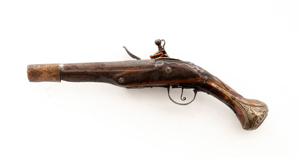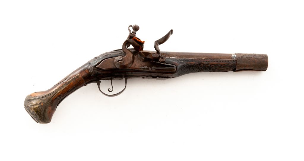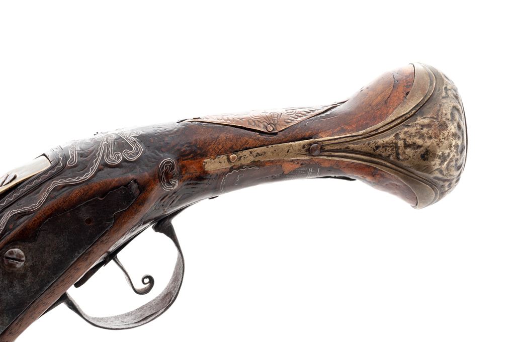 Antique Middle Eastern (perhaps Turkish) Flintlock Single Shot Holster Pistol, NVSN, approx. .60 cal., 7-5/8'' round iron barrel with etched scroll decoration and remnants of possible maker's markings (indecipherable), brass barrel tang with raised teardrop-shaped rear sighting plane; unmarked iron sideplate, and lockplate with fancy scrolled tail to frizzen; iron trigger with scrolled tail; ornate iron triggerguard with fluted bow and tree-shaped front tang; ornately decorated German silver buttcap with bulging sides and extended tangs; possibly later added brass muzzle wrap with numerous stampings of crosses, dots within circles, borders, and a crimped seam at bottom. European hardwood fullstock is ornately and fully carved, and inlaid with intricate patterns and borders of silver wire, especially around relief carved top tang apron; a diamond-shaped brass escutcheon (with stamped patterns matching the muzzle wrap) is inletted into the stock wrist; it may hide a stock repair, but is bordered by fine silver wire inlay that matches the rest of the gun. Condition is about good, appearing to be in original flintlock configuration with unbushed touchhole, an overall dark gunmetal color and scattered mild pitting to iron parts. Stock shows great age and use, possible wrist repairs and filler; bottom end of rear triggerguard tang is broken off; buttcap missing what was likely a lanyard ring. Action functions; smoothbore is dark. This was originally a richly decorated and ornate pistol. Est.: $300-$500. (Antique)