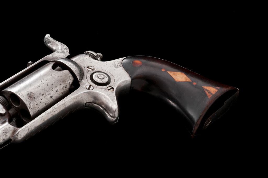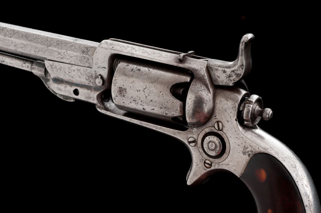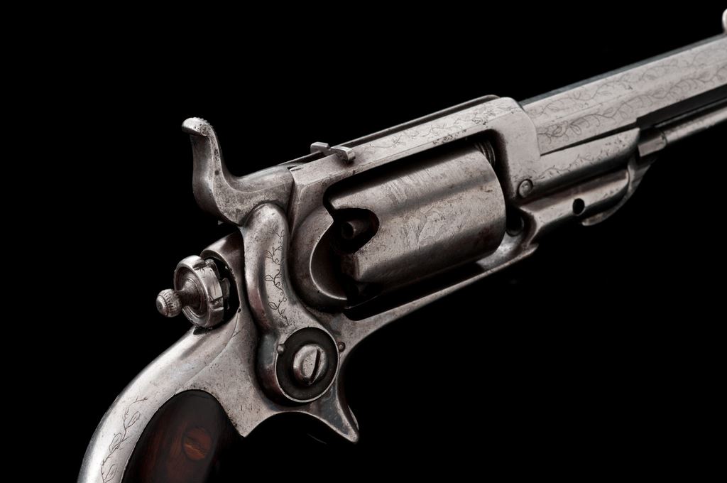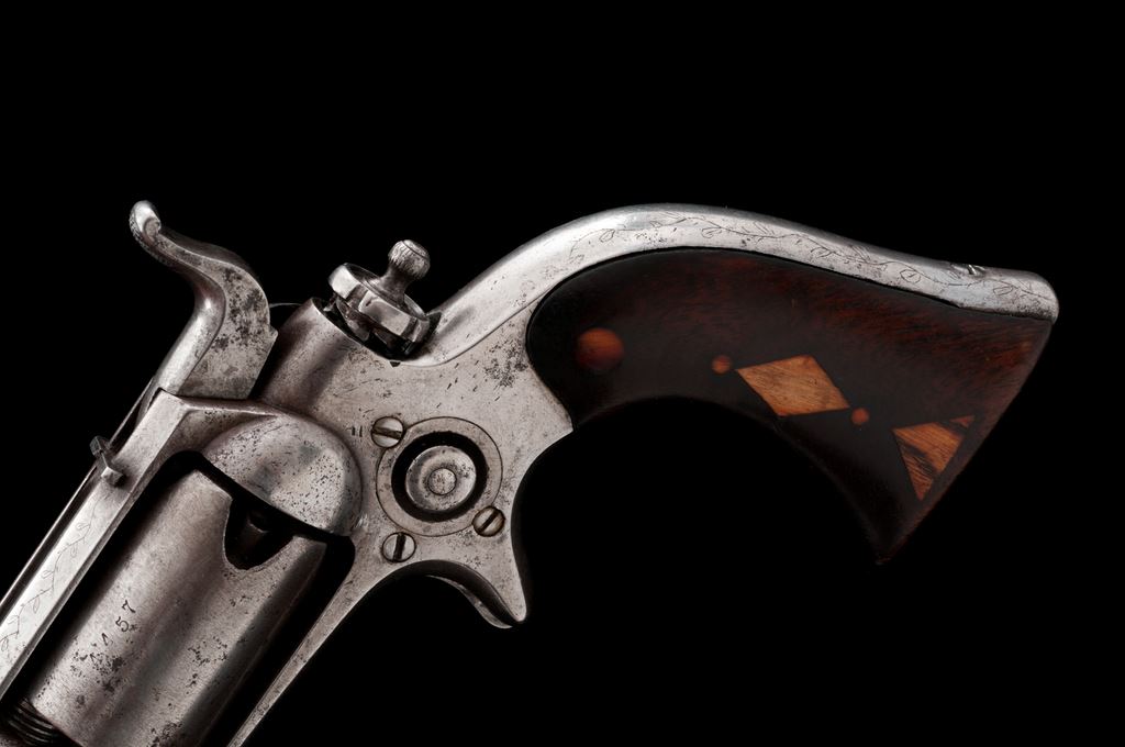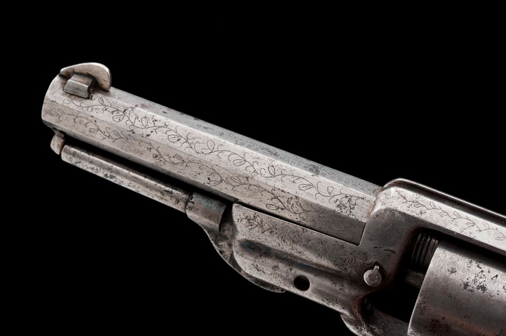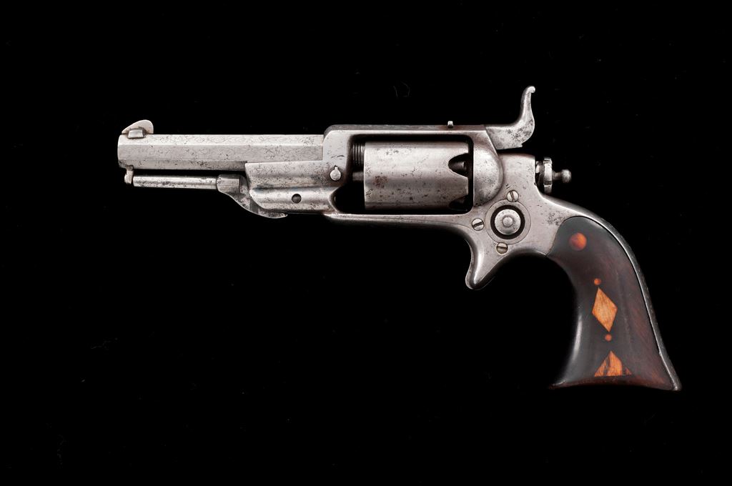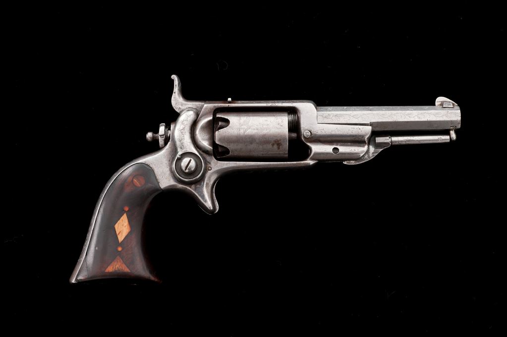 Colt Model 1855 2nd Type Root Percussion Spurtrigger Pocket Revolver, #4457, .28 cal., 3.5'' octagonal barrel having the two-line ''+Colt's Pt. Address Col. Colt / 1855 Hartford, CT. U.S.A.+'' address flanked by inward-pointing hands, and a dovetailed blade front sight, round cylinder with rolled ''Indians and Cabin'' scene, exterior hammer mounted at right side, distinctive spurtrigger, cylinder pin enters rear of frame, one-piece varnished walnut grips. Light vine hand engraving appears on barrel flats, on frame below barrel and along top and bottom straps, and along either side of backstrap. Originally blued and case hardened finishes. Condition is good, having perhaps been rusted and vigorously cleaned to bright metal with softened markings and no cylinder scene remaining; the serial number on buttstrap is only partially visible but matching. Grips are very good, smooth and undamaged, having geometric inlays in a lighter wood on both sides. Action is non-operative; bore appears clean. Est.: $350-$550. (Antique)