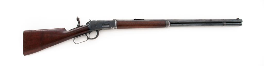 Antique Winchester Model 1894 Lever Action Rifle, #82578, .30-30 cal., 26'' octagonal barrel, blue finish, walnut stock, checkered steel shotgun-type buttplate, with combination brass/ivory bead front sight, single leaf rear sight, and Lyman tang sight. Mfg'd 1897. Condition is fine retaining approx. 80%-85% thinning later-added blue finish. This reblued rifle retains its original forend with just traces of varnish remaining. Shotgun buttstock has been repaired at toe and exhibits an additional coat of varnish. Action is good, bore is bright. Est.: $500-$750. (Antique)
