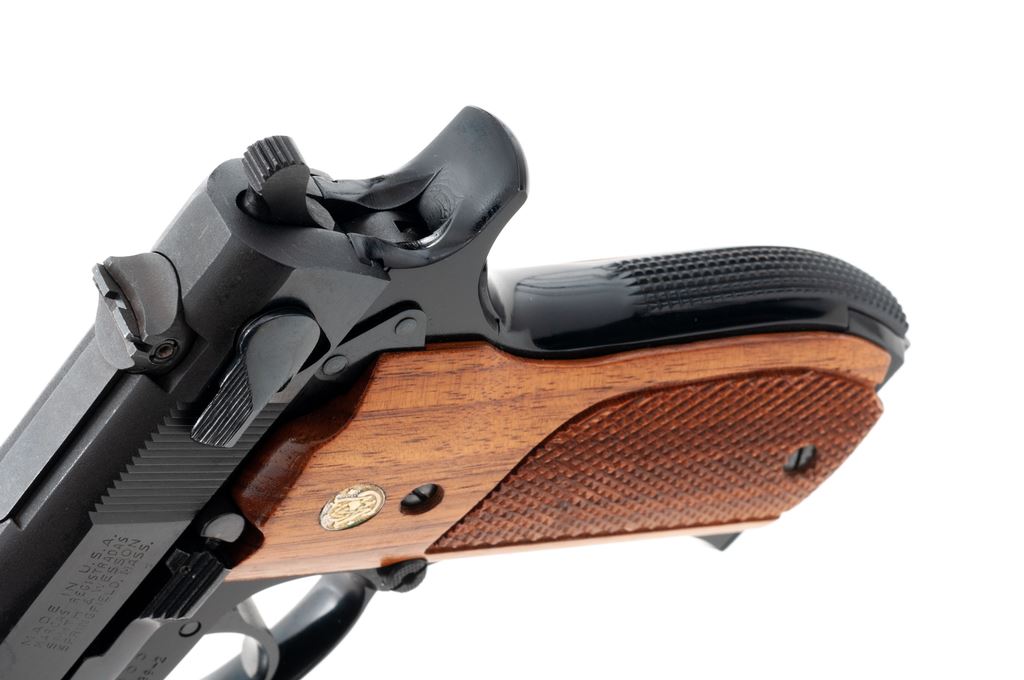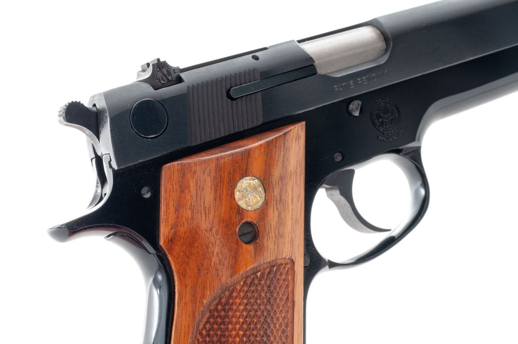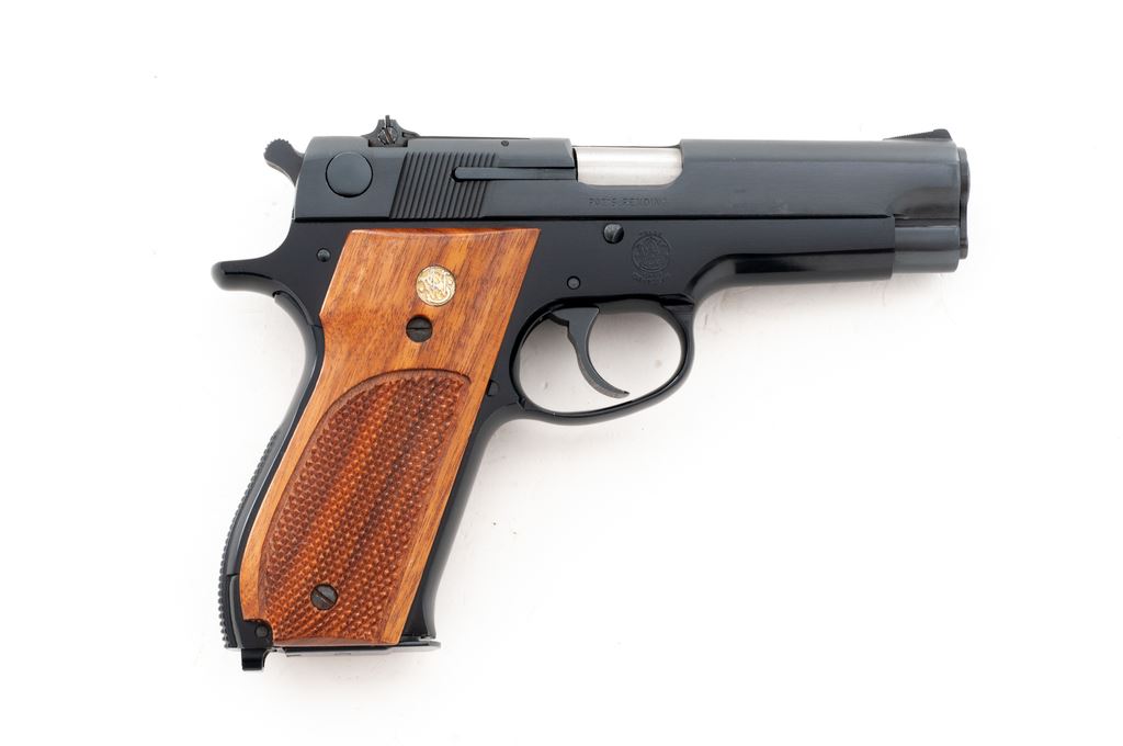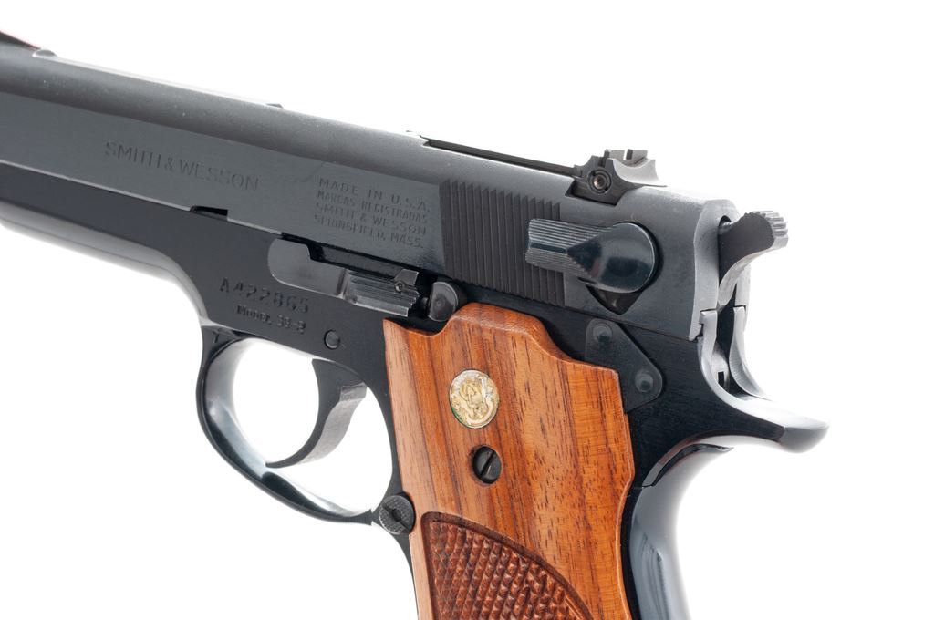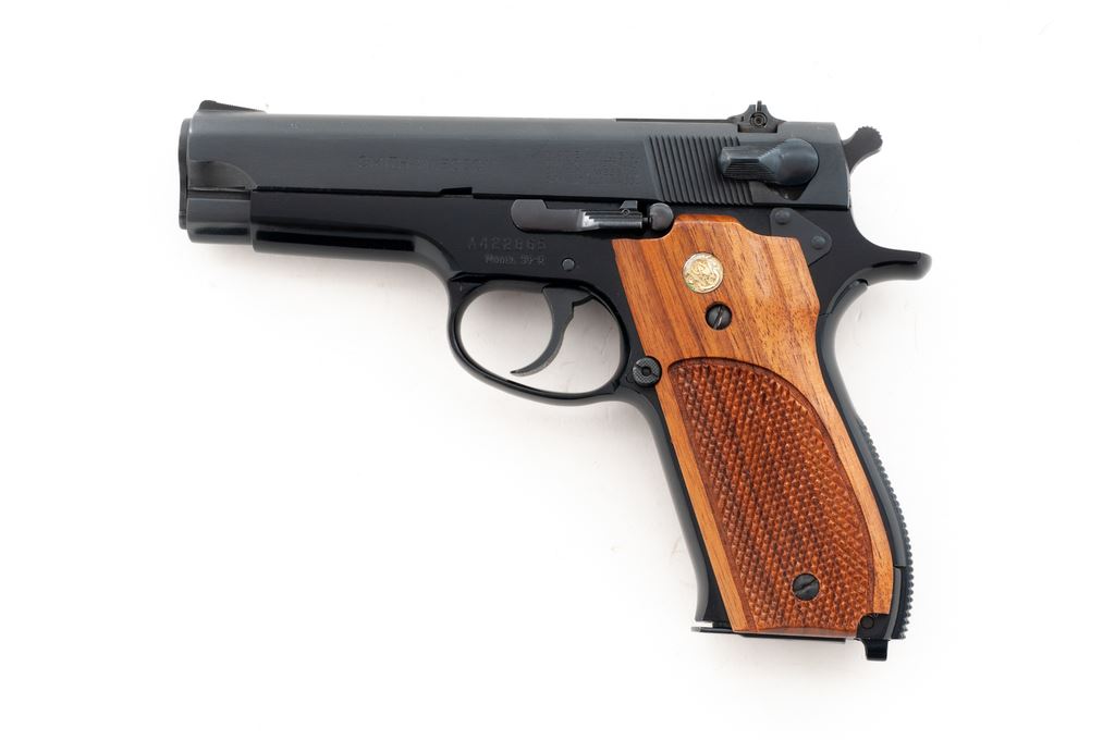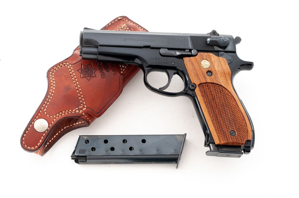 Smith & Wesson Model 39-2 Semi-Automatic Pistol, #A422865, 9mm, 4'' barrel, blue finish, factory checkered walnut grips, in Bianchi leather holster, with one extra magazine. Condition is excellent, appearing near new. Bianchi No. 19 holster is also excellent. Est.: $500-$750. (Modern/PPT)