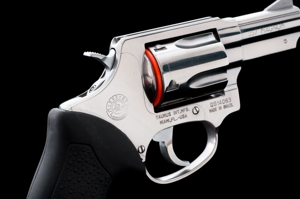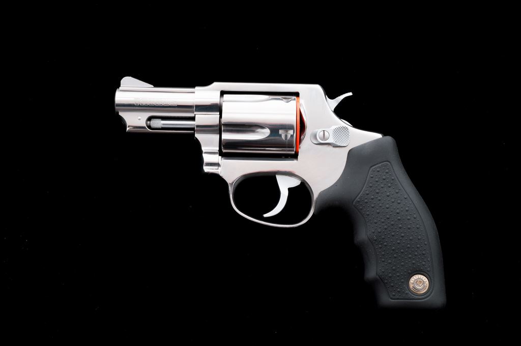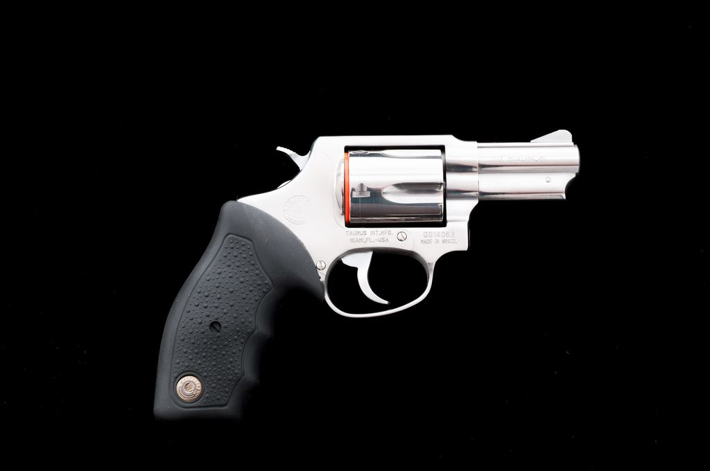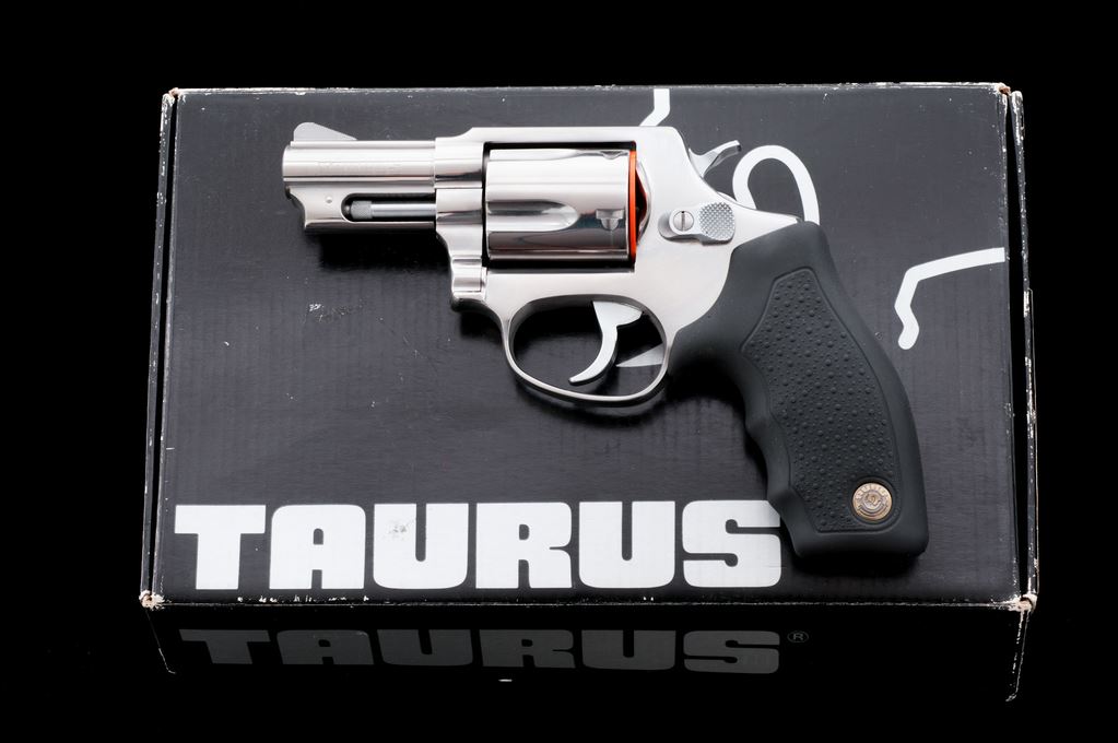 Taurus Model 605 Double Action Revolver, #WG14063, .357 mag. cal., 2-1/4'' barrel, bright stainless finish, stippled black rubber Taurus grips with finger grooves, and standard sights. In original box with matching end label, owner's manual, and two (2) internal safety keys. Condition is near excellent showing only a small amount of light handling marks to the metal and grips; cylinder with a moderate index line. Action is smooth and crisp with an excellent bore. Est.: $200-$300. (Modern/PPT)