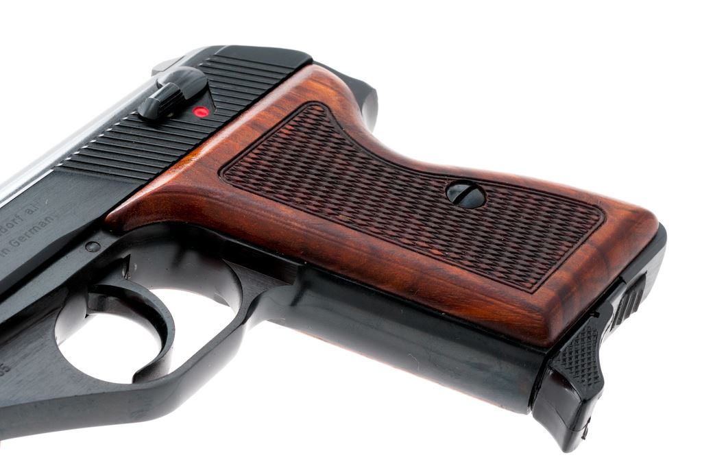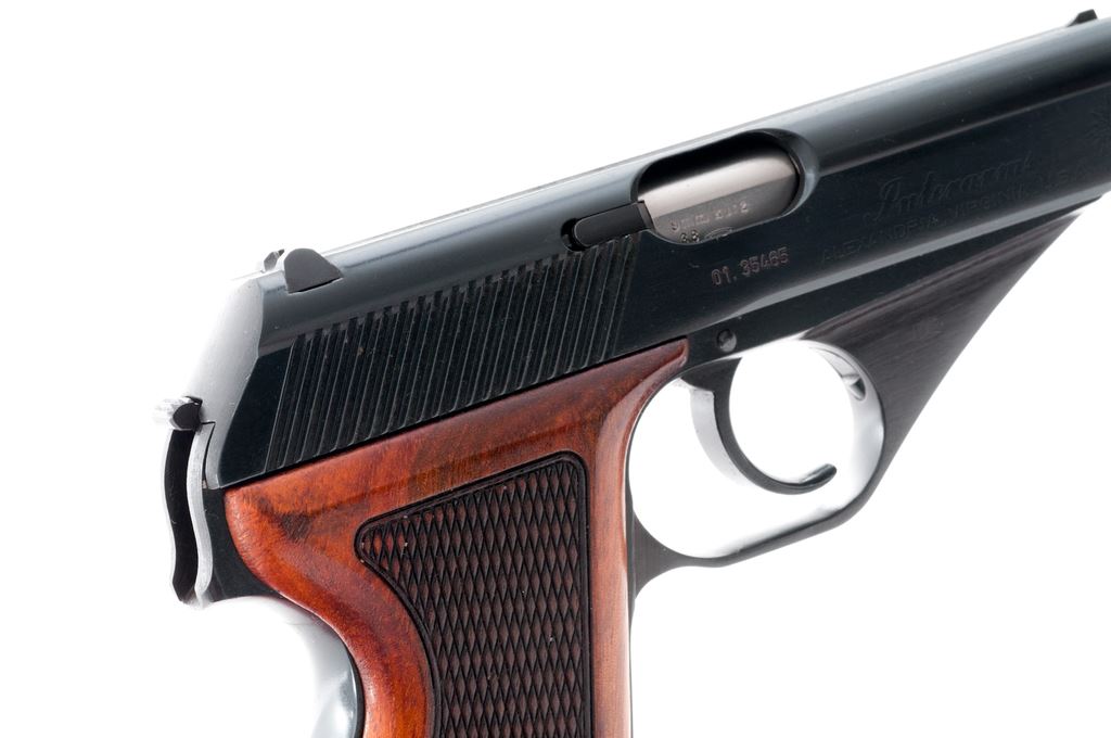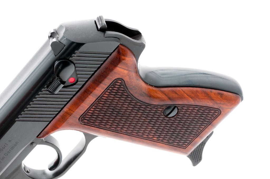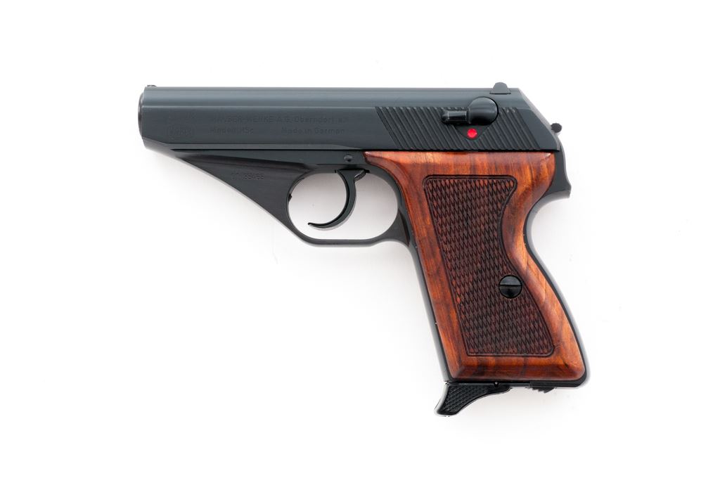 Post-War ''Original'' Mauser HSc Semi-Automatic Pistol, imported by Interarms, #01.35465, .380 ACP cal., 3.25'' barrel, blue finish, checkered wood grips, standard sights, and one unmarked magazine with black plastic finger extension. Right side of slide is Interarms marked. Frame and slide with visible matching numbers. Overall a really nice and high condition pistol with approx. 99% original finish. Factory lettering is clear. Grips with a few small marks from handling to the smooth borders; checkering is clean. Smooth and tight action, and excellent bore. Est.: $300-$500. (Modern/PPT)