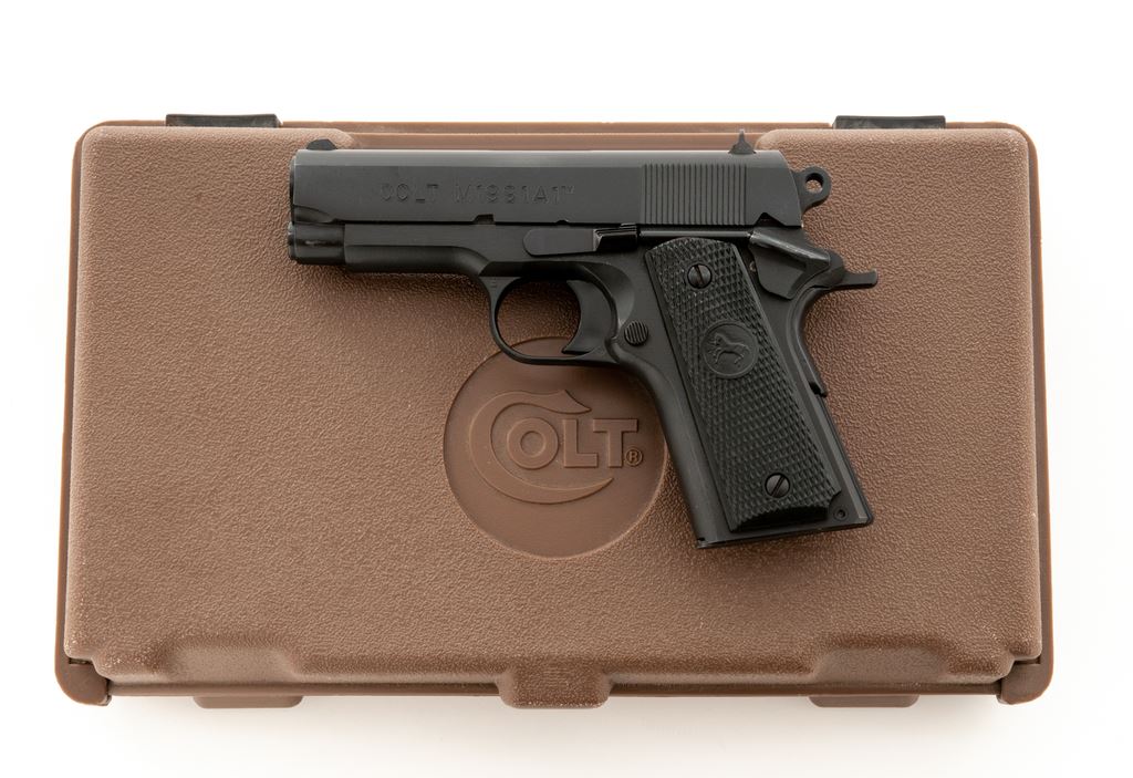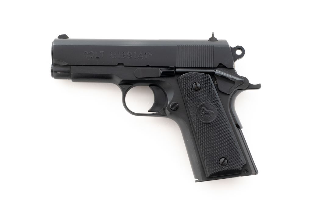 Colt Model 1991-A1 Compact Semi-Automatic Pistol, #CP08366, .45 ACP cal., 3-5/8'' barrel, parkerized finish, checkered hard rubber Colt grips, fixed white 3-dot sights, with one factory magazine. In brown plastic Colt case. Metal rates as near excellent with intermittent slight scuffs to the matte surfaces, most noticeable along top of slide. Grips are excellent with sharp clean checkering. Action is smooth and tight with an excellent bore. Est.: $500-$700. (Modern/PPT)