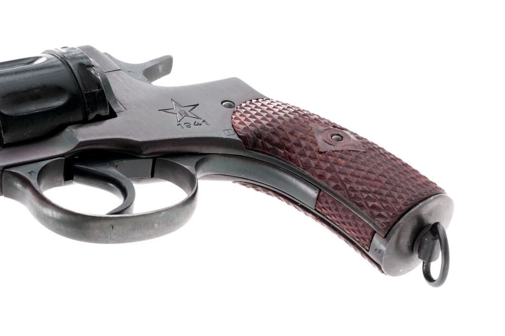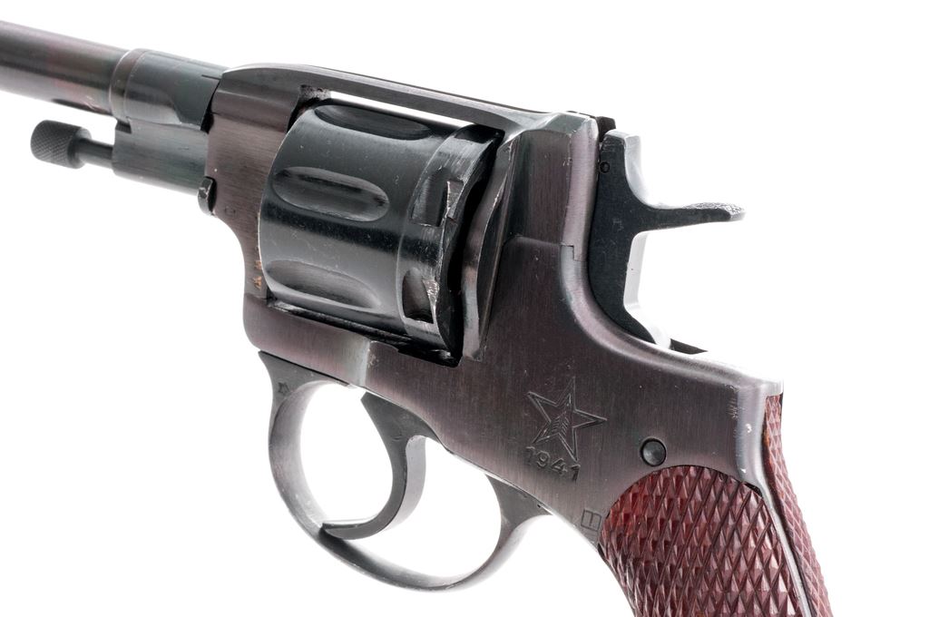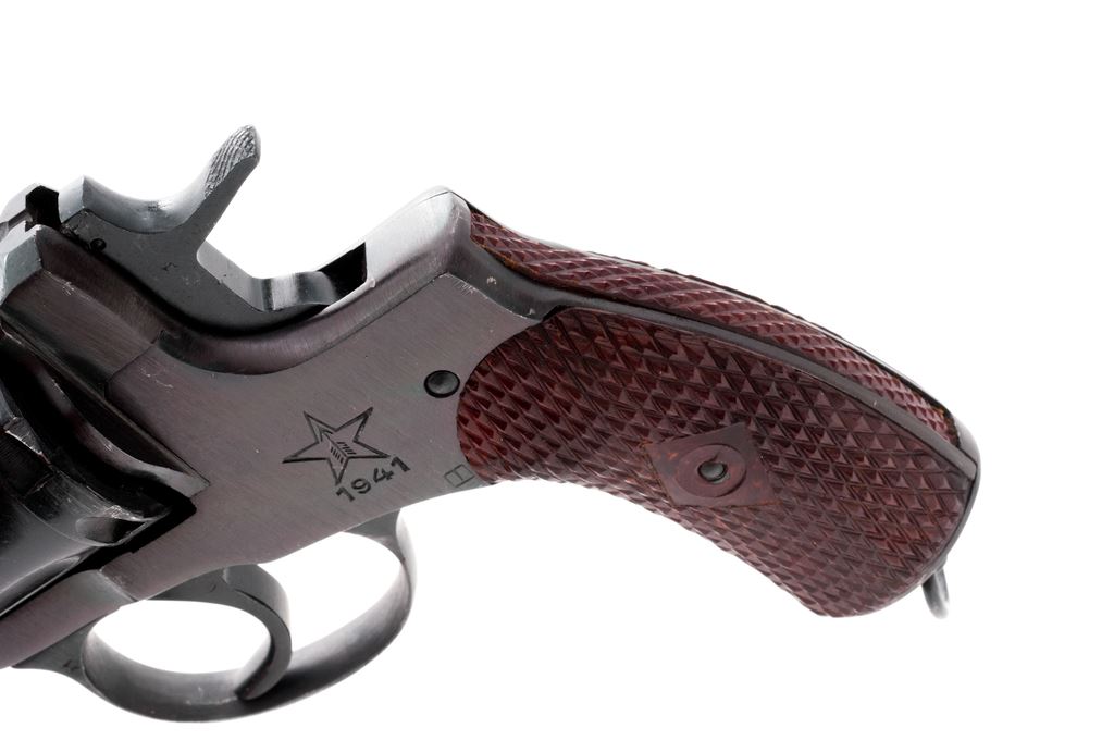 Soviet Model 1895 Nagant Double Action Revolver, #NGO3477, 7.62x38mmR cal., 4.5'' barrel, blued finish, red plastic stock grips, blade front sight and fixed ''U''-notched rear sight. Marked on left side of frame with the fletched arrow inside five pointed star of the Tula arsenal over ''1941''. Condition overall is excellent with over 95% of the dark blue finish remaining on metal surfaces, with a couple of small scratches on the barrel, otherwise showing very light wear. Grips are excellent with minor losses around the screw hole. Bore is very good and chambers are clean and bright. Import marked on right side of frame. A Soviet issue holster and cleaning rod in excellent condition are included. Est.: $200-$300. (C&R/PPT)